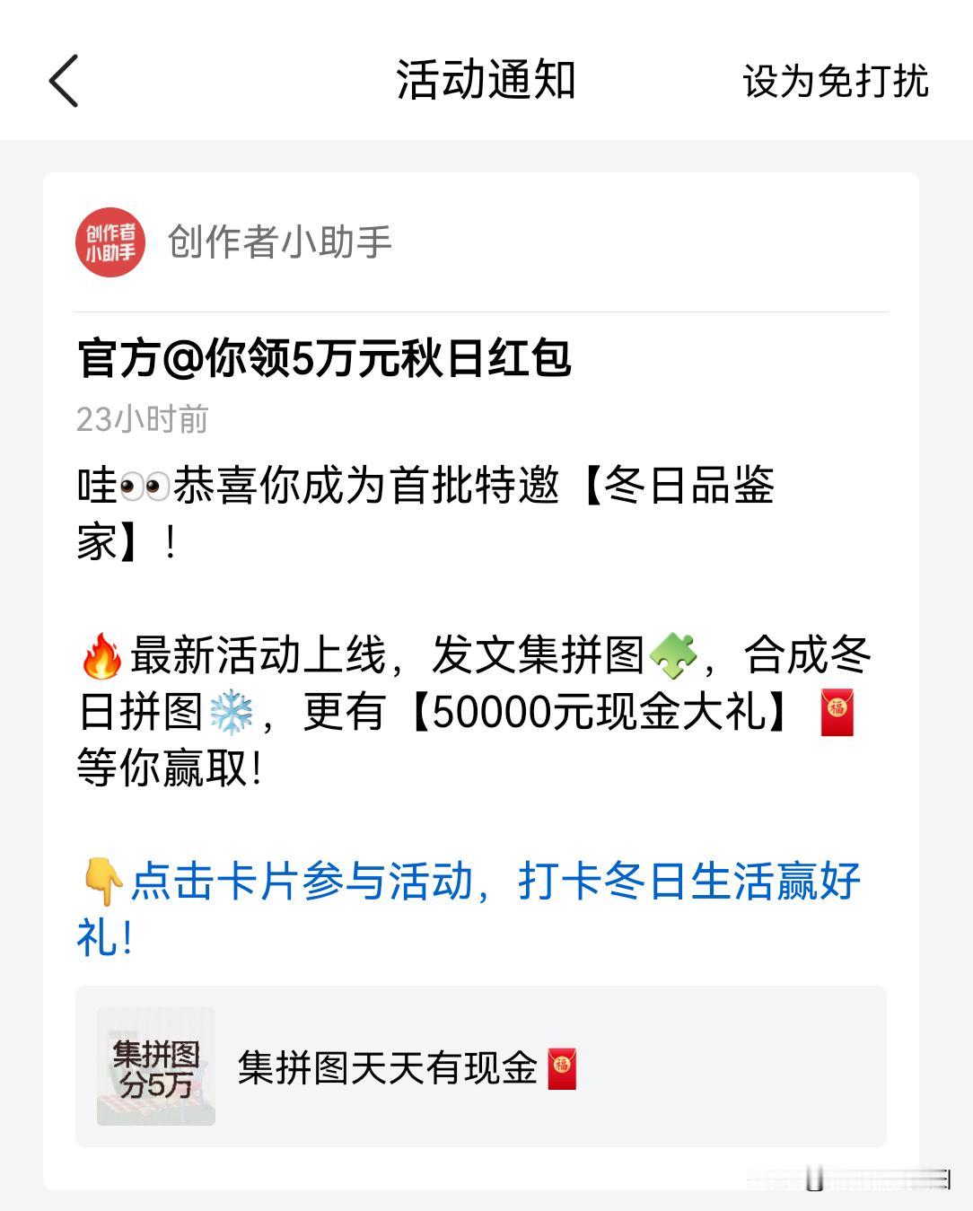 之前参加的活动已经到期结束, 正愁着没活动参加呢! 打开“创作者小助手”通知看了一下, 嘿嘿~机会来了~ 官方@你领5万元秋日红包 哇恭喜你成为首批特邀【冬日品鉴家】! 最新活动上线,发文集拼图,合成冬日拼图,更有【50000元现金大礼】等你赢取! 点击卡片参与活动,打卡冬日生活赢好礼! 立马开始整活! 咱主打一个宁杀错不放过! 先参加吧! 反正闲着也是闲着! 每次参加完一个活动后, 突然又想歇口气, 不想每天更新太多。 但转念一想, 写得少了又怕流量又不好了! 左右为难! 反复拉扯! 最后,还是决定要多写! 笨鸟就要学会先飞, 比我们优秀的人都那么努力, 我们还有什么理由偷懒呢? 继续写写写…… [捂脸][我想静静][捂脸][我想静静][捂脸][我想静静][捂脸][我想静静]