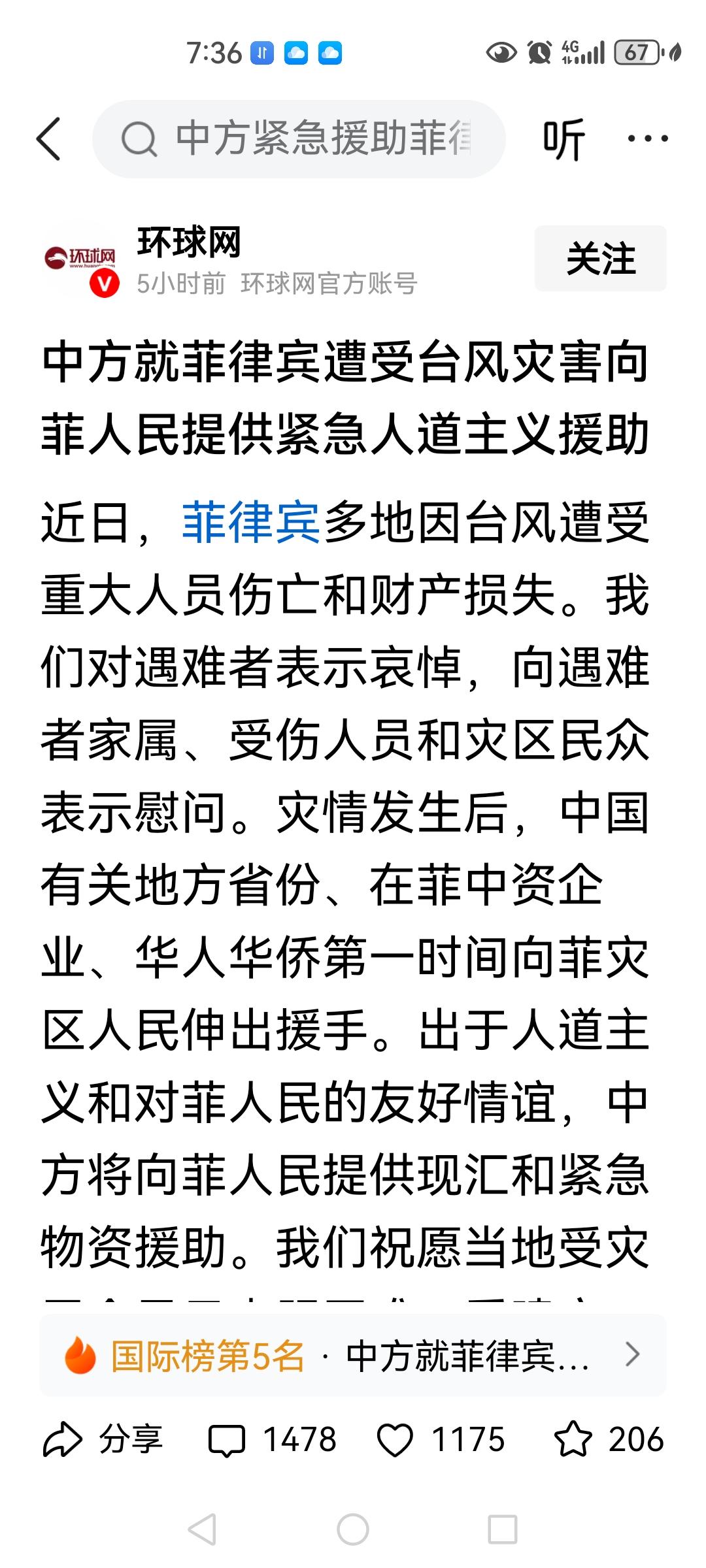中国将向菲律宾提供人道主义援助物资 中国的外交智慧是无与伦比的,但是我们也应该清楚的是菲律宾政府如今的政府组成就是菲律宾人民自己的选择。既然要选择这样的政府你就应该承担为此引起的一切后果,而我们国家不计前嫌,向他们输送援助物资的做法,我表示不能理解,但是国家的事情是大事,自然有自己的考量,我就在这里评论了。 菲律宾政府不能一边偷盗中国的领土,一边又要让我们给他给援助,这是前后矛盾的事情。但是我们希望菲律宾人民要明白谁对你们好,你们必须要明白其中的因果关系,而不是经常给中国菲律宾关系制造障碍。