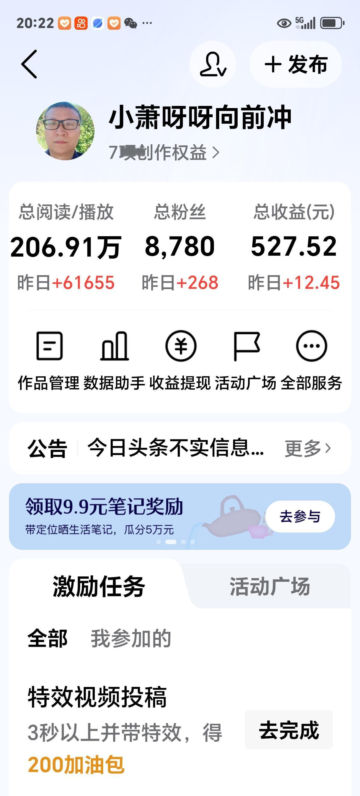 我曾刷到一位大叻的作品,他说那天收益很低。阅读量才四万,当天收益才80…… 哇塞!我的心跳都加速了。单价竟然高达20,难怪有人在头条上写文章月入过万不是梦。单篇文章阅读量几十万的对那些大叻来说也就是小菜一碟。 我们这些小虾米就没法比了。我昨天的阅读量出来了,6万多点点,收益12块多点点。粉丝数量涨了近300个。 我也不知道平台是怎么算的,但我不怪平台偏心。人家大叻象心灵书坊日更20篇,而我一天更两篇都已经使出了吃奶的力量。算起来我已经是占平台便宜了,已经是心满意足了。
