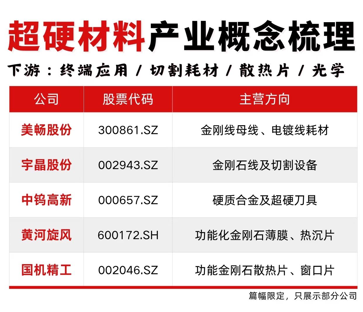 以下是对“超硬材料产业概念梳理”的总结: 该资料将超硬材料产业链分为上游、中游和下游,并分别梳理了相关代表企业及其主营业务,旨在帮助理解超硬材料产业的主要构成与关键公司。 一、上游:原料、合成设备与人造金刚石生产 上游主要是超硬材料的原材料供应、核心生产设备制造以及基础人造金刚石的生产环节,是整个产业链的技术与原料基础。代表性企业包括: - 中兵红箭(000519.SZ):旗下中南钻石是全球领先的人造金刚石与立方氮化硼(CBN)生产商。 - 黄河旋风(600172.SH):业务涵盖人造金刚石、培育钻石、金刚线锯及六面顶压机等关键设备。 - 力量钻石(301071.SZ):专注于工业级与培育级的金刚石单晶及微粉。 - 国机精工(002046.SZ):提供六面顶压机、MPCVD金刚石生长设备及相关散热材料。 - 惠丰钻石(839725.BJ):主要产品为金刚石微粉及培育钻石相关粉末材料。 这些公司构成了超硬材料从原料到初级产品的重要生产端。 二、中游:超硬制品及相关工具、耗材 中游是超硬材料的进一步加工与应用环节,主要生产各类超硬制品、工具、切割耗材等,是连接上游原料与下游应用的关键环节。主要公司有: - 四方达(300179.SZ):生产PCD(聚晶金刚石)、PCBN复合片及聚晶拉丝模具等。 - 岱勒新材(300700.SZ):专注于电镀金刚石线,主要用于光伏硅片切割。 - 三超新材(300554.SZ):提供金刚石工具、CBN刀具及线锯设备。 - 沃尔德(688028.SH):产品包括精密金刚石刀具、微粉及PCD刀片,面向高精度加工市场。 - 博云新材(002297.SZ):聚焦于超硬复合材料与硬质合金的研发与生产。 这些企业将上游的基础材料加工成可直接用于下游工业制造或终端应用的产品与工具。 三、下游:终端应用与功能材料 下游是超硬材料的最终应用领域,包括切割耗材、散热材料、光学元件、终端工具等,直接服务于新兴产业与高端制造。部分代表性企业如下: - 美畅股份(300861.SZ):主要生产金刚线母线及电镀线耗材,广泛应用于切割领域。 - 宇晶股份(002943.SZ):提供金刚石线及配套切割设备,服务光伏等高端制造。 - 中钨高新(000657.SZ):业务涉及硬质合金及超硬刀具,服务于切削与加工行业。 - 黄河旋风(600172.SH):除上游外,也涉及功能化金刚石薄膜与热沉片等高端功能材料。 - 国机精工(002046.SZ):还生产功能金刚石散热片与窗口片,应用于散热与光学等领域。 此外,资料提到下游还包括如终端应用、切割耗材、散热片、光学等多个细分方向,应用前景广泛,尤其是在新能源、半导体、精密加工、航空航天等领域。 总结 这份“超硬材料产业概念梳理”系统地展示了超硬材料产业链的全貌,从上游的原料与设备,到中游的制品与工具,再到下游的终端应用与功能材料,覆盖了整个人造金刚石及超硬材料产业的核心环节与主要企业。所列举的公司不仅在技术研发与生产上具有重要地位,也代表了当前中国超硬材料产业的发展现状与未来方向,特别是在培育钻石、光伏切割、精密加工、散热材料等热门领域具备较强的市场竞争力与增长潜力。