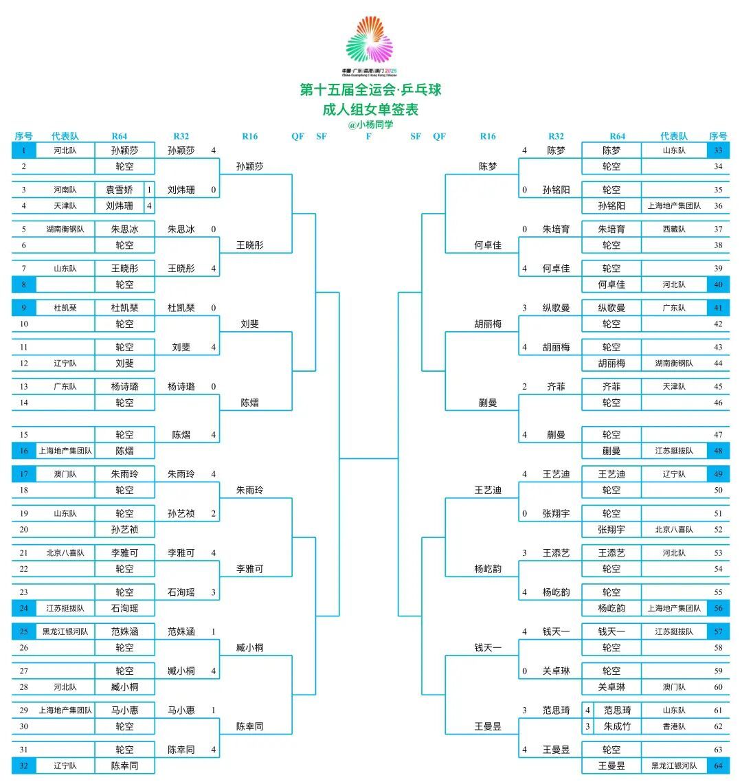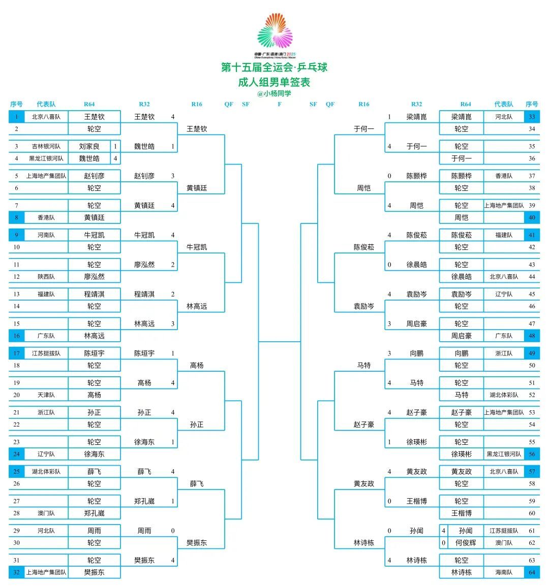 [ 第15届全运会乒乓球男女单十六强对阵!]王楚钦(北京八喜队)🆚黄镇廷(香港队)牛冠凯(河南队)🆚林高远(广东队)高杨(天津队)🆚孙正(浙江队)薛飞(湖北体彩队)🆚樊振东(上海地产集团队)于何一(河南队)🆚周恺(上海地产集团队)陈俊菘(福建队)🆚袁励岑(辽宁队)马特(湖北体彩队)🆚赵子豪(上海地产集团队)黄友政(北京八喜队)🆚林诗栋(海南队)孙颖莎(河北队)🆚王晓彤(山东队)刘斐(辽宁队)🆚陈熠(上海地产集团队)朱雨玲(澳门队)🆚李雅可(北京八喜队)臧小桐(河北队)🆚陈幸同(辽宁队)陈梦(山东队)🆚何卓佳(河北队)胡丽梅(湖南衡钢队)🆚蒯曼(江苏挺拔队)王艺迪(辽宁队)🆚杨屹韵(上海地产集团队)钱天一(江苏挺拔队)🆚王曼昱(黑龙江银河队)