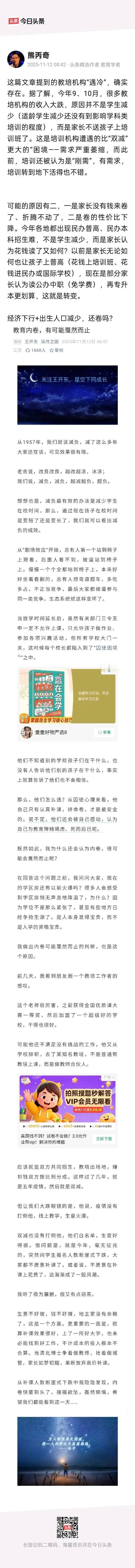 教育专家:家长观念转变,教培不好干了 教育专家熊丙奇发表了他的观点,今年的教培机构明显遇冷,不得不度过一段困难的时期。 熊丙奇也说了,造成这种情况的重要原因 第一,家长没有钱了,折腾不了了,现在经济下行,很多家庭基本条件也都过得不好,放在教育上的投资也减少了。 这也是不得已的原因。 第二,很多家长也忽然发现现在教培的性价比太低了,花了很高的钱却得不到很好的成绩,所以也不打算再花这份钱了 这种情况也是现实存在的 归根结底还是家长观念的变化,而家长观念的变化很多情况下还是由于当前的教育形势所导致的。 因为在今天,教育的投入已经不是一项能够撬动未来发展的有力杠杆了,不能够帮助很多的家庭,很多的孩子实现阶层的跨越,更多的是国家普及人口素质当中的一环。 所以,对很多家庭来讲也没有必要了,上补习班确实能起到一定的效果,但目前来看很有限,而且性价比不高。 家长观念的变化,带动社会补习班的这个行业的遇冷,这也是可以想见的,这也是正常的,也是我们国家教育未来改革发展的一个明显的转变信号