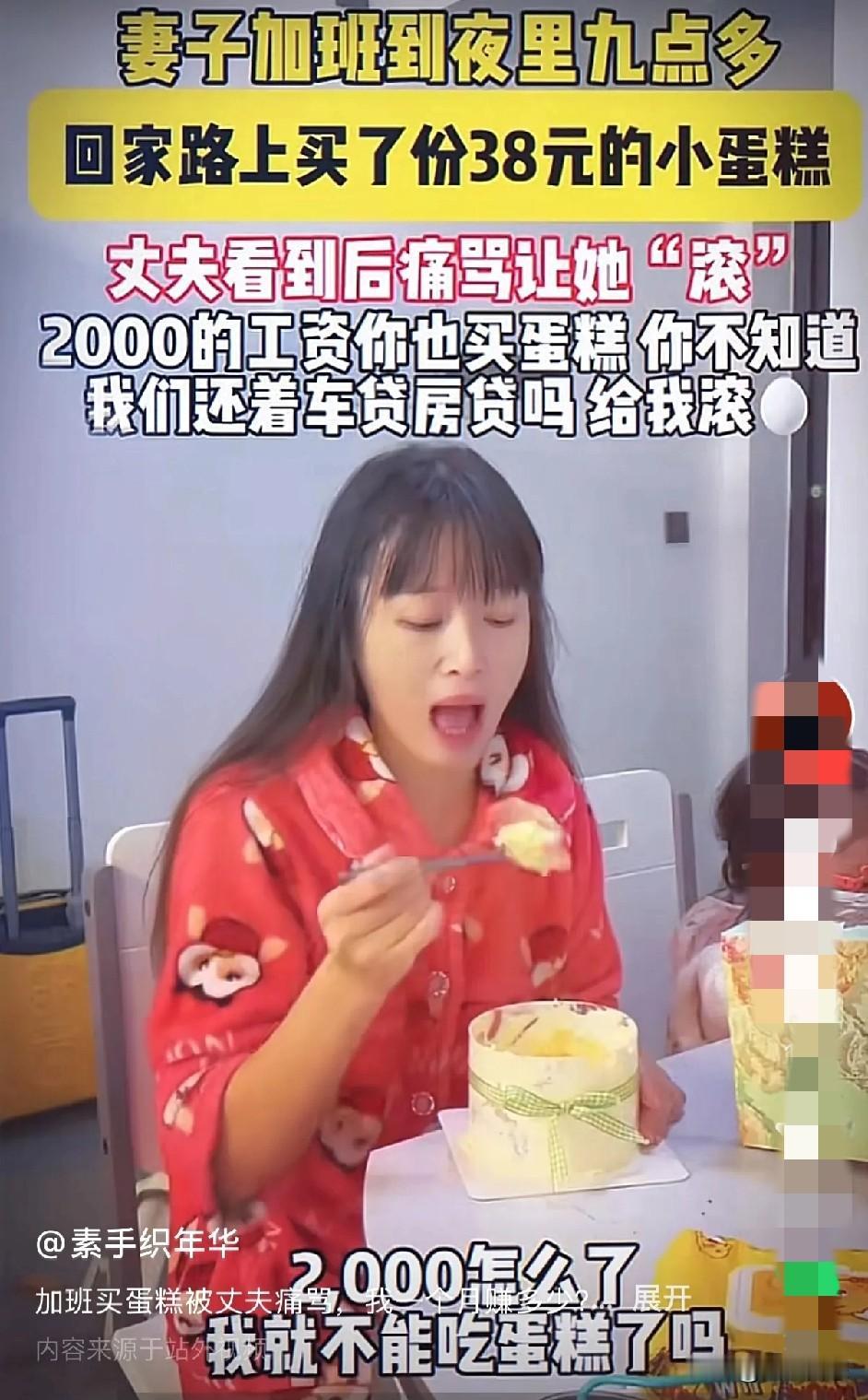 妻子加班到九点,买38元蛋糕犒劳自己,丈夫让她滚!月薪2000,到底配不配吃一块38元的蛋糕? 说真的,月入两千真没资格矫情。车贷房贷压力不大吗?38块够一顿午饭了,一点不为家庭着想,娶个这样的老婆真够累的。 这不是蛋糕的问题,是态度问题!家里明显经济紧张,你还这么不谨慎,就是自私!你丈夫压力也大,你体谅他了吗? 贫贱夫妻百事哀,这就是活生生的例子。在现实面前,爱情和温情屁都不是,没钱就别学人家玩浪漫。 这次是蛋糕,下一次呢?压垮婚姻的,真的是经济,还是那颗再也无法相互体谅的心?