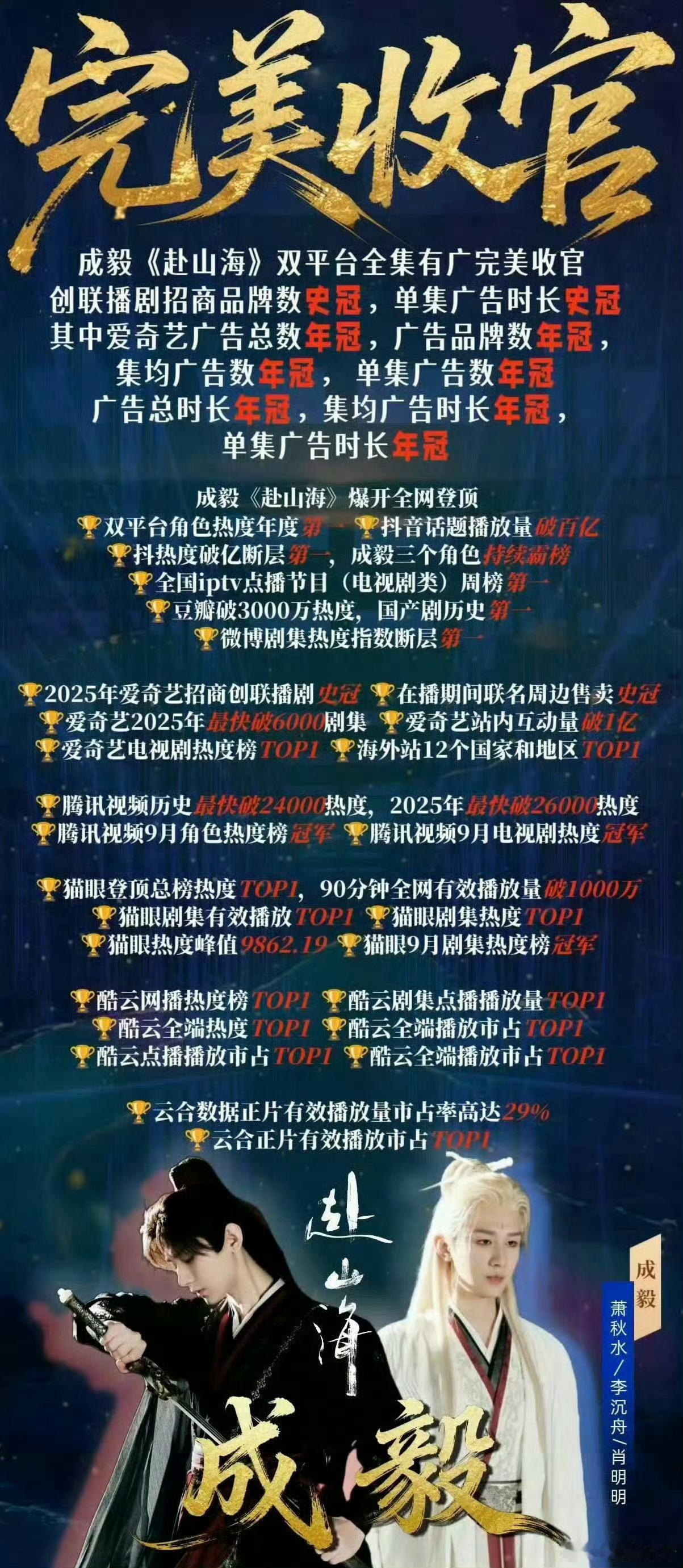 内娱对成毅的“在意”,简直写满双标!《赴山海》开分人数破40万+创纪录,《天地剑心》23万开分+全集满广,双剧霸屏拿下60+品牌合作,王权富贵十亿角色热度断层登顶,aqy站内弹幕互动量4亿+,话题声量无人能及!单站内热度飙升520%的疯涨曲线,实打实的国民度号召力!这份扛剧实力与商业号召力谁看了不眼红?怕e蝶的凝聚力无可匹敌!越防爆越能打,这就是成毅的硬实力底气~