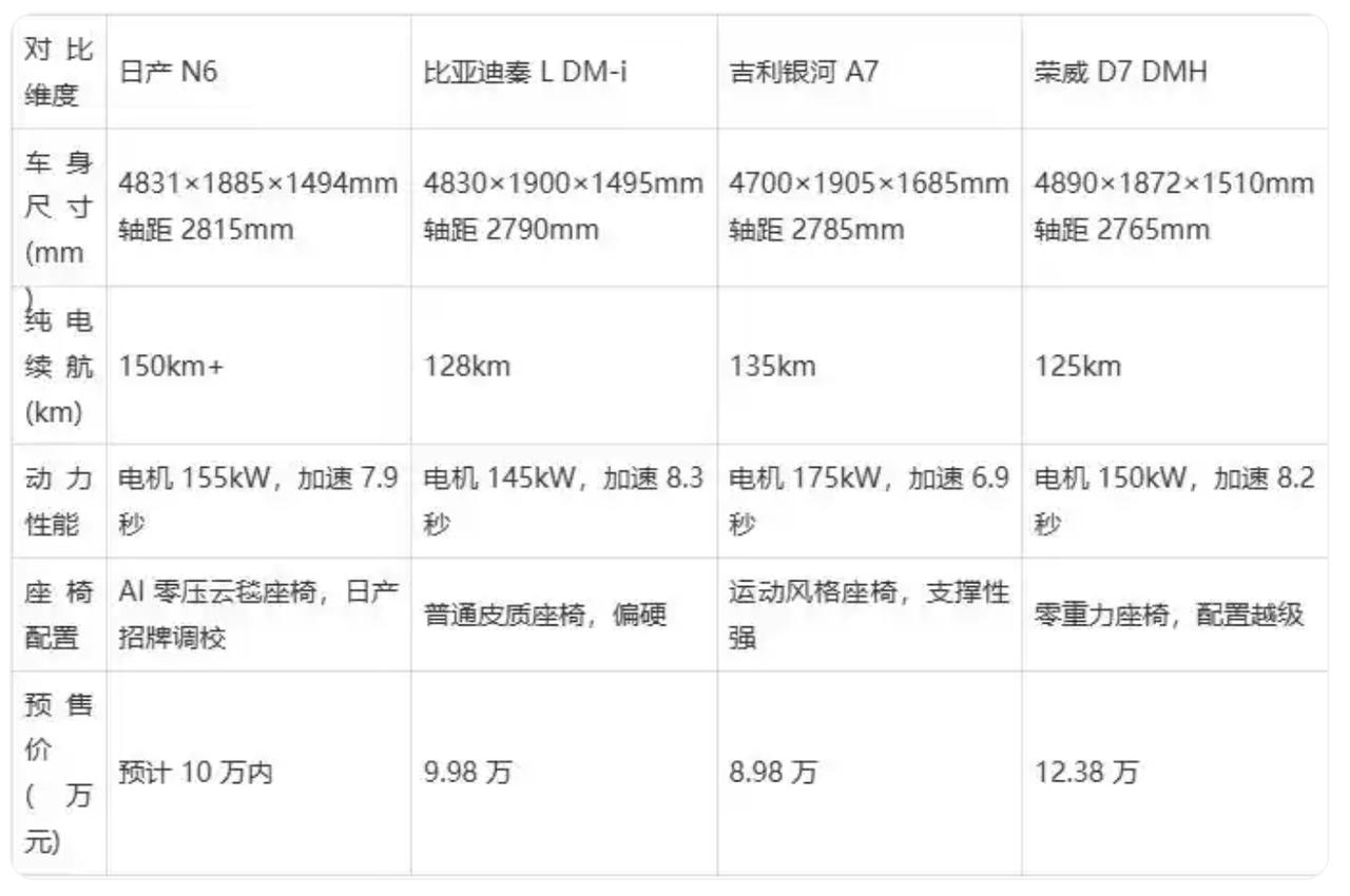 日产N6静态的时候没来,动态的时候重点体验了下,说下静态感受。 这是一个新车,全新开模全新调教,这是肯定的啦,东风日产N6靠研究院搞出来也是体现了本土研发能力有多重要。 东风日产N6我觉得跟银河A7 EMi很像,大空间,强智能。 东风日产新出的这几款车,想的都非常明白,就是大空间,油耗低,经济耐用,而且再把自己过去大沙发的形象给放大一下,同时再把合资车企过去表现不好的智能化给彻底扭转一下,这台车就成了。我觉得东风N7带给大家的就是一种合资车企大象转身的即视感。 智能化我是体验了一下,觉得是真的非常优秀,从音乐、画面、语音识别,包括仪表盘的小提示。 大沙发还是大沙发的,AI云舒座椅坐上去非常舒服,而且它的后排非常明显,你用手去压,它非常柔软,非常柔软。 新装了1.5升的串并联混动,这一点大家都知道了。发动机的功率相比较同级来讲有一点点弱,但是电机的功率偏大。20多度的电池,纯电续航180。 我对这款车的一个评价就是,想的明白,定位非常准,只要价格到位,没理由不大卖。 但是注意这个但是,这个级别里面强者如云,太多了,特别是插混车有比亚迪,有银河,有上汽,有长安。 东风日产以前就有串并联插混,这点怪我,太不熟悉日产了,每次查缺补漏都能忘掉,叫DD-i。 这一套1DHT的混动,应该是东风日产和东风汽车一起做的,最开始启辰大V DD-i上搭载的还是一台DFMC的1.5T涡轮增压发动机,但在全新的东风日产N6身上,是一台代号为NR15的1.5L自吸发动机,这是东风日产为插混动力总成专门做的一台发动机,在郑州生产的。 网上有许多图是对比比亚迪秦L、银河A7、荣威D7(最新的是荣威M7 DMH)能看出来这台车的定位。 我开这台车的时候就感觉很熟悉,在网上找了些底盘布置图,吃饭的时候也看了下,心里慢慢有了一个答案,毕竟东风日产能这么快的拿出来两台过去从来没有露脸的全新车,我就有些浮想联翩。 对了,东风日产N6和N7外观区别看起来就像是把小獠牙挪了挪位置,我觉得N7比较好看些,大家觉得呢?【来自懂车帝车友圈】