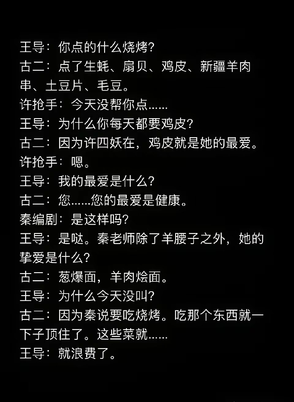 古二点外卖的录音,听了好窒息!王家卫、秦雯、许思窈哪是把古二当成了助理,分明是当成了佣人,此时此刻,突然就想起了赵丽蓉老师的那句话,“那整一个jiu社会。”许思窈爱吃鸡皮,秦雯的最爱是羊腰子,两位编剧的品位真是与众不同,其实也对,品味越独特的人就越难“伺候”,之前王家卫的品位,不就是港圈最独特的吗?
