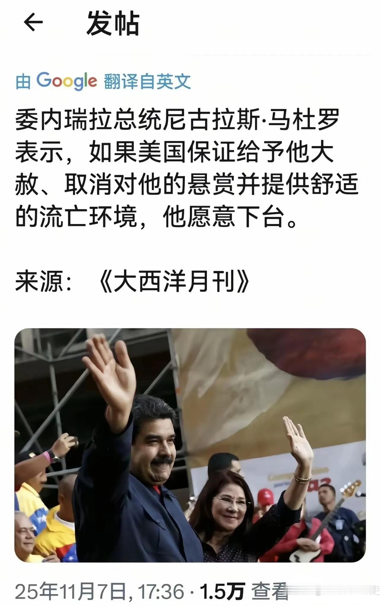 马杜罗愿意妥协下台? 据美国媒体《大西洋月刊》透露,委内瑞拉总统马杜罗表示,如果美国保证给予他大赦、取消对他的悬赏并提供舒适的流亡环境,他愿意下台。 如果马杜罗真的有像这个媒体所说的想法,美国也答应了,那他最终的下场不会好到哪去。 为什么? 因为美国的承诺,你马杜罗也敢信,你这边一弃械投降,他立马把你捉去美国审判,下场可能就如同巴拿马前总统诺列加一样,最后诺列加本人被判处140年有期徒刑,你马杜罗真落到那种境况,刑期估计不会比诺列加少多少年。 退一步来说,你马杜罗真不想干了,逃亡也要选择一个敢硬刚美国的国家,比如俄罗斯,像叙利亚前总统阿萨德下台后,就跑去莫斯科当起了“寓公”。只不过,什么舒适的环境、锦衣玉食的生活就不要想了,能安稳过完余生算不错了。 当然消息是由美国媒体报道,真实性存疑,何况目前马杜罗的位置看起来还比较稳,他是否会走到流亡这一步不好说。