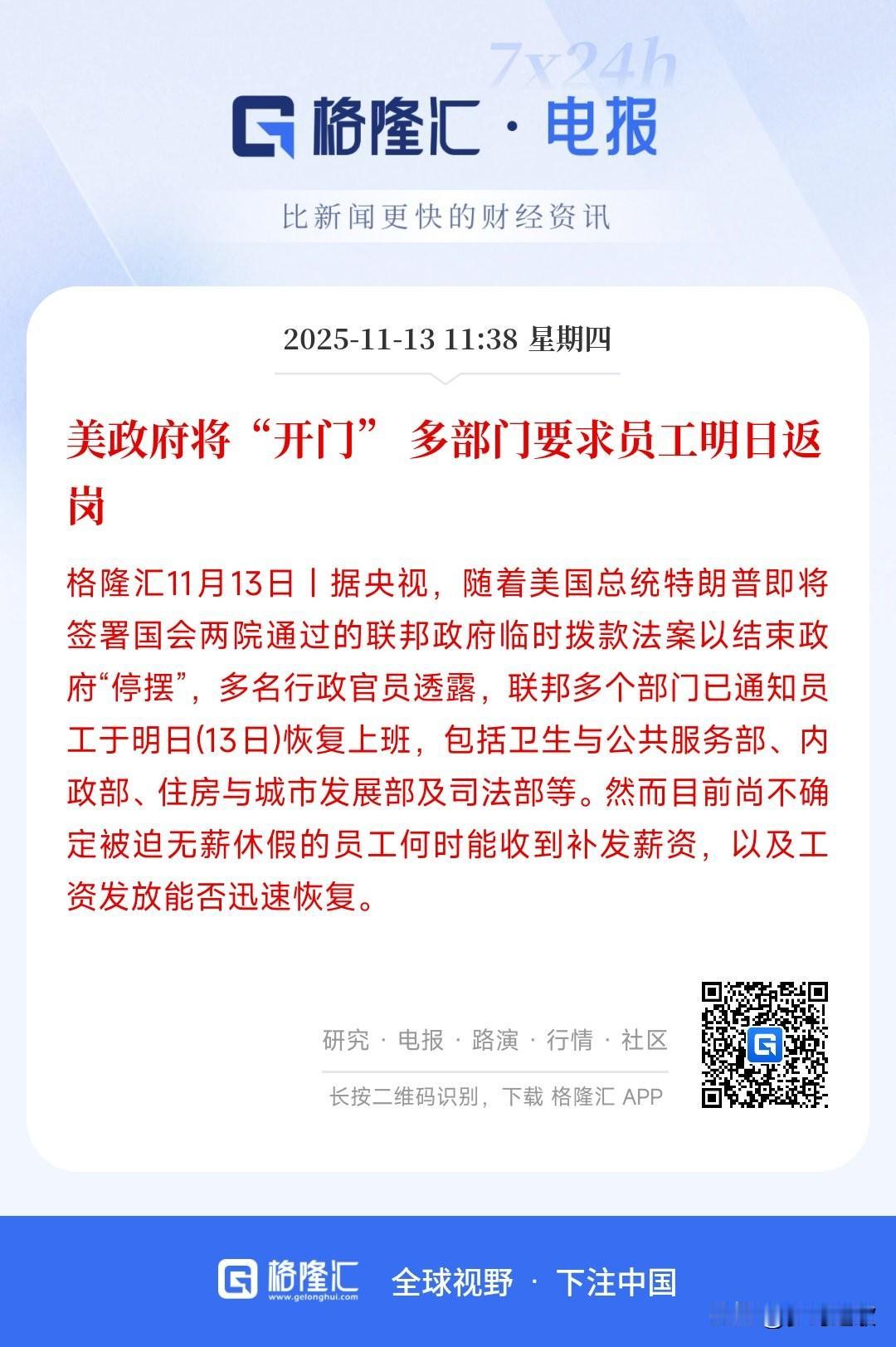 美国政府的停摆结束了,就在今天雇员开始上班了 美国的各项数据终于可以正常公布了,这次停摆是最长记录达到了43天,特朗普已经签署法案,今天所有员工将恢复上班,但薪资能不能发放还是个未知数。 这次停摆对于资本市场来说非常难受,美国的数据完全没有,资本市场没有参考,就连12月美联储能不能降息现在还无法预测。 这次的停摆结束也预示着新一轮的博弈开始了,数据将会支撑美联储的下一步动作,现在全世界都在等待美国公布数据。