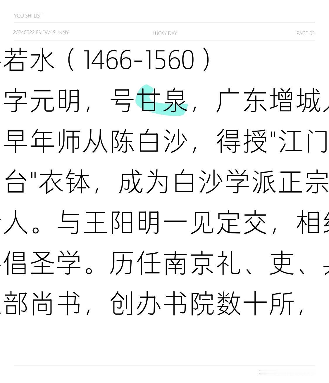 心学源流之湛若水——随处体认的圆融强大 湛若水(1466 - 1560),字元明,号甘泉,广东增城人士。早年拜陈白沙为师,获传“江门钓台”衣钵,成为白沙学派的正宗传人。他与王阳明一见如故,结为至交,相约共同倡导圣学。他曾先后担任南京礼、吏、兵三部尚书,创办了数十所书院,门下弟子近四千人,由此形成了与阳明学派并立的甘泉学派。 当世人要么执着于静坐修行,要么一味偏重事功时,湛若水以“随处体认天理”这六个字,为我们呈现了另一种强大——那是在日常行事中坚守本心的圆融力量。 湛若水虽得陈白沙“静坐见心体”的教诲,却未被静坐之法所局限;他与王阳明论学长达数十年,也不局限于一家之说。他的学问历经三次转变,最终构建起“心事合一”的圆融体系。这种不偏执一方的包容态度,正是《中庸》中“和而不流”的鲜活写照——既能汲取各家学说的精华,又能坚守自我本性,能在学术的碰撞中保持中立不偏。 “随处体认天理”,看似平淡无奇,实则蕴含着深刻的内涵。“随处”,意味着读书做事、待人接物、静坐冥想,无处不是修行的场所;“体认”,是全身心的体悟印证,而非简单的认知理解;“天理”,就是心的本体,无需到心外去探寻。这一功夫要求我们在每一个当下都保持觉察,就像明镜能映照万物却不沾染尘埃。如此修行,才能在纷繁复杂的世事中保持内心的澄澈与坚定。 湛若水提出“心事合一”的观点,将《中庸》“合内外之道”的思想发挥到了极致。心与事相融合,能让内在的修养自然地转化为外在的事功;内与外相统一,使静坐养心与日常应酬完美结合。这种贯通内外的修行方式,成就的是真正“国有道不变塞,国无道至死不变”的大丈夫风范。