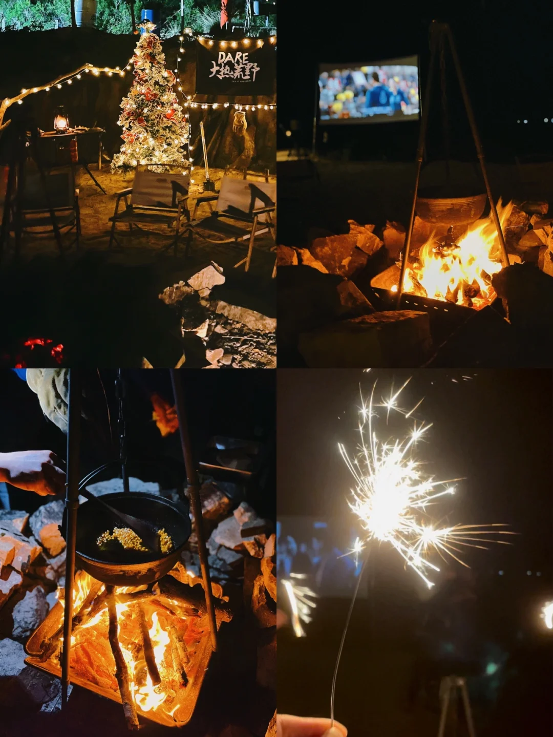 🌙晚上和同行小伙伴们一起围着篝火,现制爆米花🍿️,玩着仙女棒🎇、看露天电影🎬、聊聊天,玩玩游戏,又是无忧无虑的夜晚