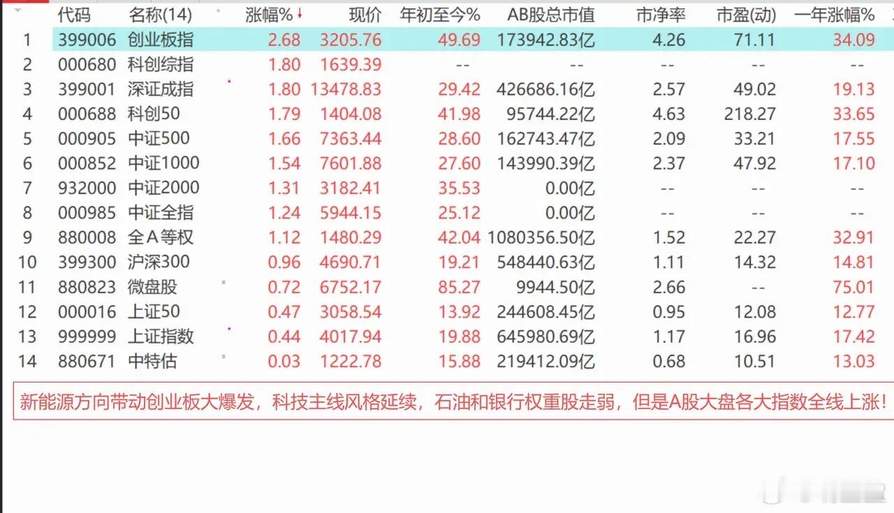 逆势突围!国际油价大跌+港股走弱,A股独涨,新能源有色掀涨停潮!全球市场分化加剧的背景下,A股走出了独立强势行情:一边是国际油价暴跌、中概股与港股同步走弱,另一边是A股各大指数全线飘红,新能源与有色板块集体爆发,资金做多情绪显著升温!1、美股分化,半导体板块强势反攻昨夜美股三大指数呈现涨跌分化态势,道指上涨0.68%,创下历史新高,纳指则微跌0.26%。其中半导体与贵金属成为核心亮点,在AMD超威半导体的带动下,美股芯片股掀起反攻热潮。AMD CEO苏姿丰对全球AI芯片市场释放重磅乐观预期,称人工智能数据中心市场规模将从今年的2000亿美元,在5年内扩张至万亿美元级别,受此提振,AMD股价单日大涨9%,直接带动整个半导体板块走强。2、欧佩克月报大转向,国际油价暴跌4%昨日欧佩克发布的月度石油报告引发市场震动。此前数月,欧佩克始终坚持“石油市场将长期供不应求”的判断,而本次月报却突然转向,明确指出随着全球石油供应持续增加,2026年市场将出现供应过剩格局。这一预期反转直接引发国际油价大幅跳水,单日跌幅接近4%,能源市场格局迎来重要调整。3、中概股+港股同步回调,亚太股市表现偏弱受市场情绪传导影响,昨夜美股中概股表现疲软,纳斯达克中国金龙指数逆势下跌1.46%;今日亚太股市整体走势偏弱,日韩股市维持横盘震荡,澳大利亚股市跌幅接近1%。在这一背景下,港股早盘承压走弱,恒生指数全程在水下弱势震荡,午间收盘跌幅约0.6%,恒生科技指数跌幅进一步扩大至0.8%左右,与A股走势形成鲜明反差。4、A股走出独立行情,各大指数全线上涨面对外围市场的调整压力,A股今日选择“不跟跌”,强势走出独立上涨行情。上证指数早盘震荡走高,午间收盘报4017.94点,涨幅达0.44%;科技相关指数表现更为亮眼,深证成指上涨1.8%,创业板指大涨2.68%,科创50指数上涨1.79%。值得关注的是,创业板龙头股单日大涨超8%,这一方向不仅是今日盘前直播的重点解读领域,上周日也已通过研究笔记提前布局提示。5、板块爆发!新能源+有色领涨,半导体同步回暖今日A股板块呈现“多点开花、核心突出”的格局,新能源与有色成为绝对领涨主线: 碳酸锂上游资源板块掀起涨停潮,全天上涨9.82%,近期碳酸锂期货价格持续走强,这一方向此前已在收评中多次强调看多逻辑; 有色板块受益于国际金价、银价近几个交易日的持续大涨,上午领涨两市,板块涨幅达4.68%; 新能源的强势表现带动电气设备板块同步走高,涨幅达4.66%,创业板龙头的带动效应显著; 半导体板块受美股行情传导,上午上涨1.9%,成功收回关键支撑位上方,板块情绪逐步修复。总结:4000点震荡后方向明朗,能源资源成新一轮主线大盘近期在4000点附近反复洗盘震荡,技术层面早已形成突破走势,而基本面与国际形势均无实质性利空干扰,当前核心矛盾已转向新一轮行情的方向布局。从今日行情来看,能源与资源赛道的领涨地位确立,尤其是新能源板块已呈现清晰的趋势性行情,完全符合此前预期。随着市场分化加剧,A股独立行情的持续性值得期待,后续主线方向也愈发明朗,聚焦能源、资源核心赛道,有望把握新一轮上涨红利。
