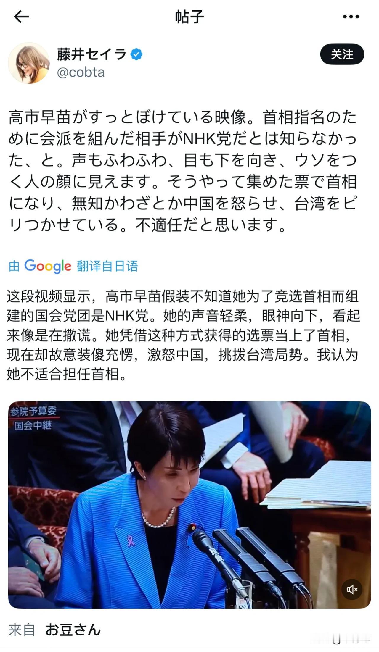 一位日本人的批评。 高市早苗其实很善于伪装,“她的声音轻柔,眼神向下,看起来像是在撒谎。” 但不得不说,这种伪装很奏效。 “她凭借这种方式获得的选票当上了首相,现在却故意装傻充愣,激怒中国,挑拨台湾局势。我认为她不适合担任首相。” 现在的问题,她的首相能当几年?一年?两年?三年?[笑哭]