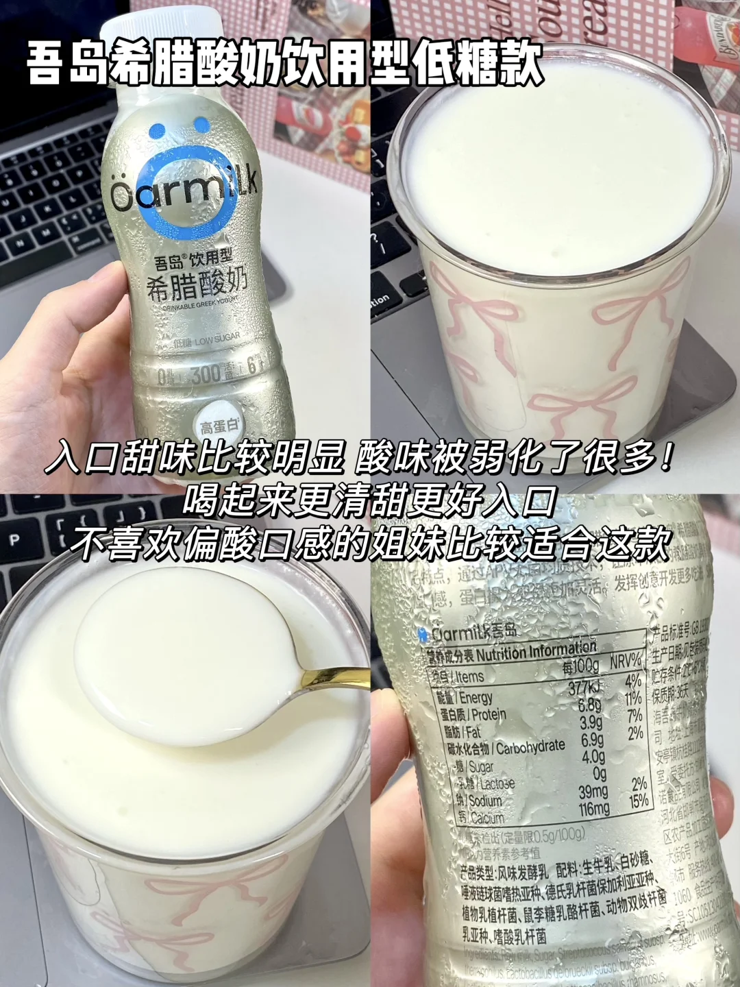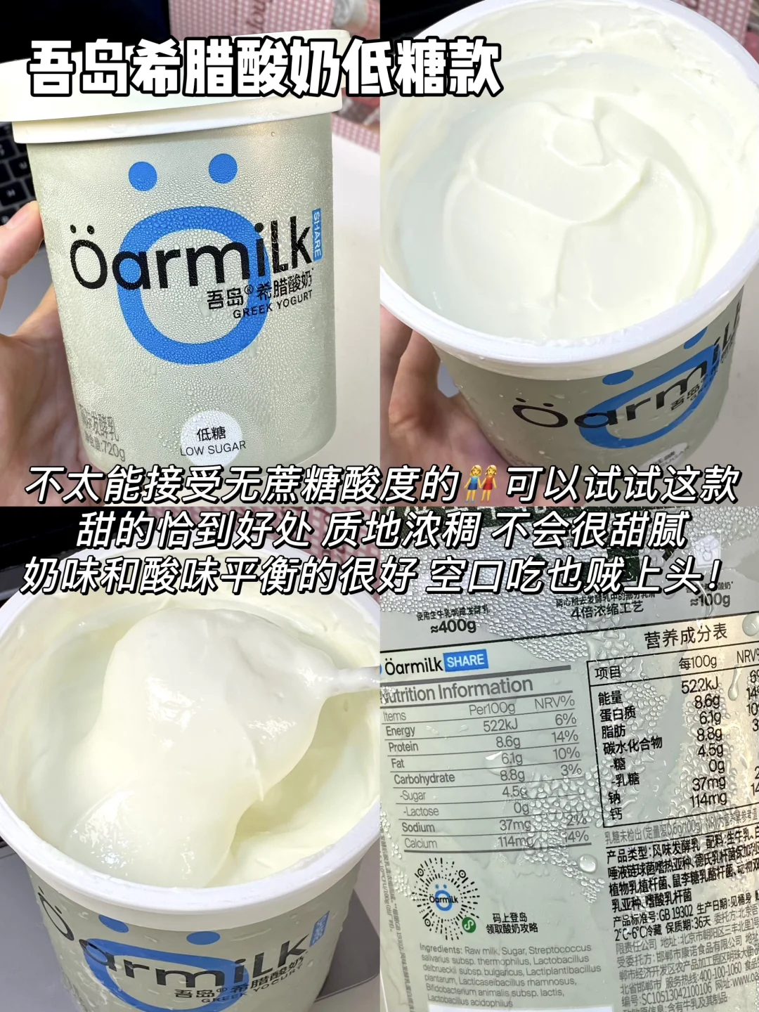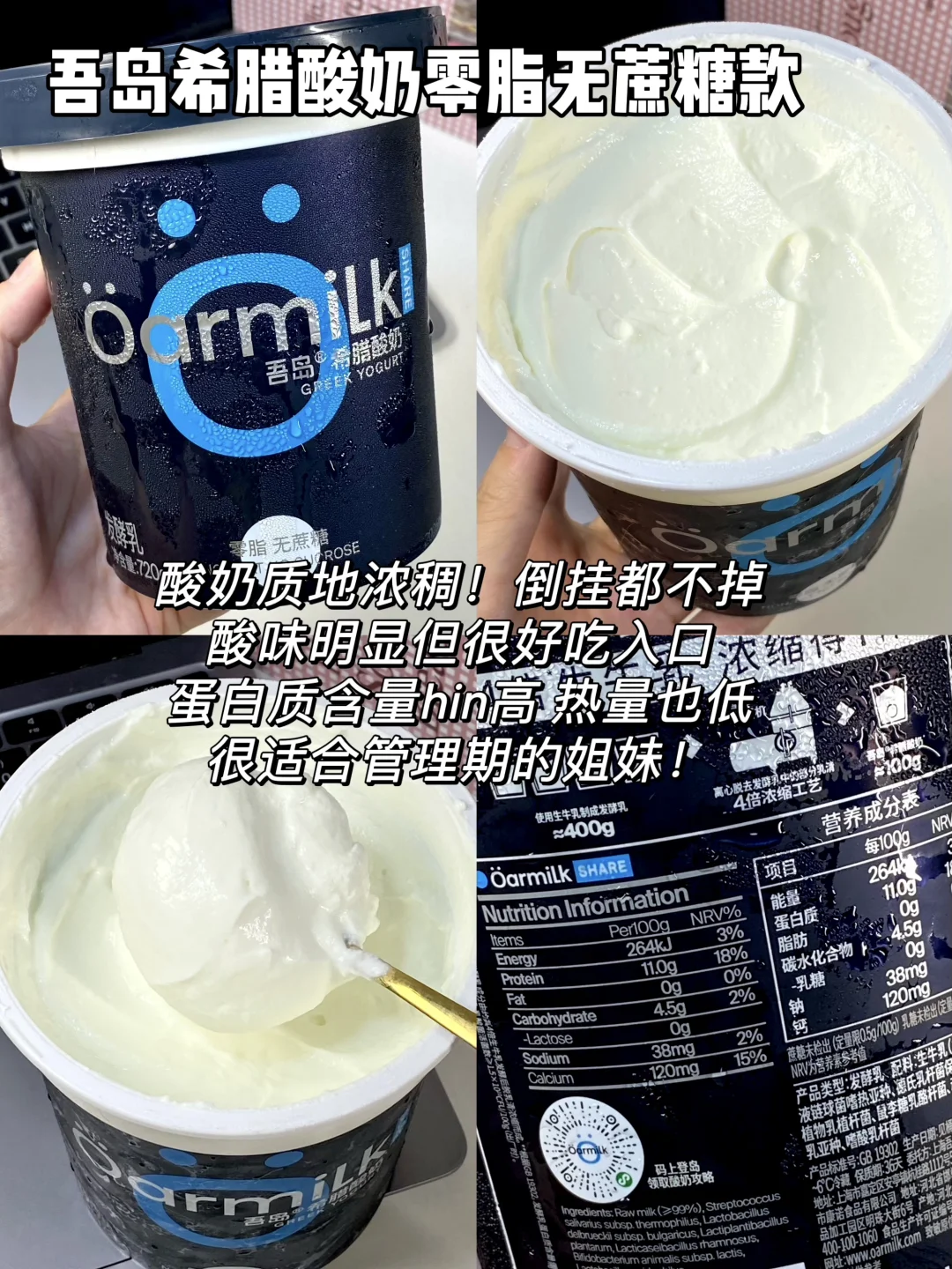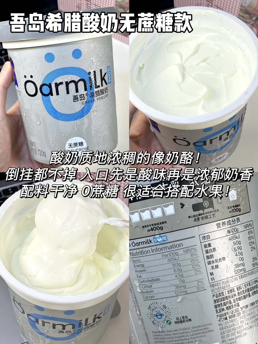 最近超火的吾岛酸奶直接all in了整个系列 今天从口感、热量、配料三个方面给大家测评下 喜欢喝酸奶的姐妹一定不要错过咯 - 1⃣️吾岛希腊酸奶零脂无蔗糖款 热量:63kcal/100g 蛋白质:11g/100g 配料:99%生牛乳+6种有益菌,0⃣️蔗糖0⃣️乳糖配料超级干净,低热高蛋白 2⃣️吾岛希腊酸奶无蔗糖款 热量:116kcal/100g 蛋白质:9g/100g 配料:99%生牛乳+6种有益菌,0蔗糖0乳糖,配料很干净,没有乱七八糟的添加 3⃣️吾岛希腊酸奶美拉德无蔗糖款 热量:112kcal/100g 蛋白质:9g/100g 配料:99%生牛乳+6种有益菌,0蔗糖0乳糖 4⃣️吾岛希腊酸奶低糖款 热量:132kcal/100g 蛋白质:8.6g/100g 配料:生牛乳+6种有益菌,加了白砂糖,入口微甜 5⃣️吾岛酸奶低糖款 热量:100kcal/100g 蛋白质:3.2g/100g 配料:95%生牛乳+4.5%白砂糖+6种有益菌,0乳糖 6⃣️吾岛酸奶无蔗糖款 热量:83kcal/100g 蛋白质:3.4g/100g 配料:99%生牛乳+6种有益菌,0蔗糖0乳糖 7⃣️吾岛希腊酸奶饮用型无蔗糖款 热量:81kcal/100g 蛋白质:7g/100g 配料:99%生牛乳+6种有益菌,0蔗糖0乳糖 8⃣️吾岛希腊酸奶饮用型低糖款 热量:90kcal/100g 蛋白质:6.8g/100g 配料:生牛乳+白砂糖+6种有益菌,0乳糖 9⃣️吾岛芭乐酸奶 热量:92kcal/100g 蛋白质:3g/100g 配料:生牛乳+6种有益菌+真实果肉果酱,0乳糖 - 由于吾岛家多了过滤乳清的步骤 因此他家的酸奶相比普通酸奶会更加浓稠 同时蛋白质含量也会更高~ 而且吾岛全线都是0⃣️代糖0⃣️乳糖的 乳糖不耐受的姐妹也可以放心喝!