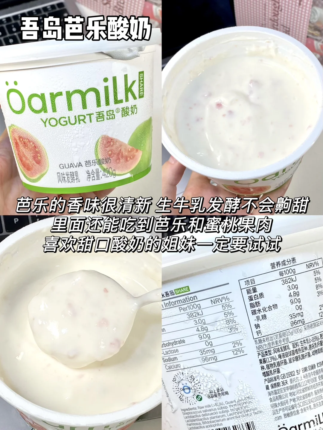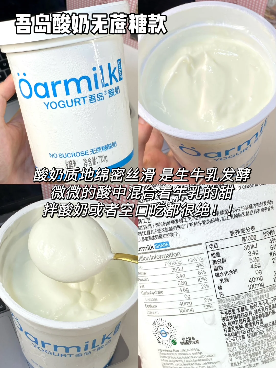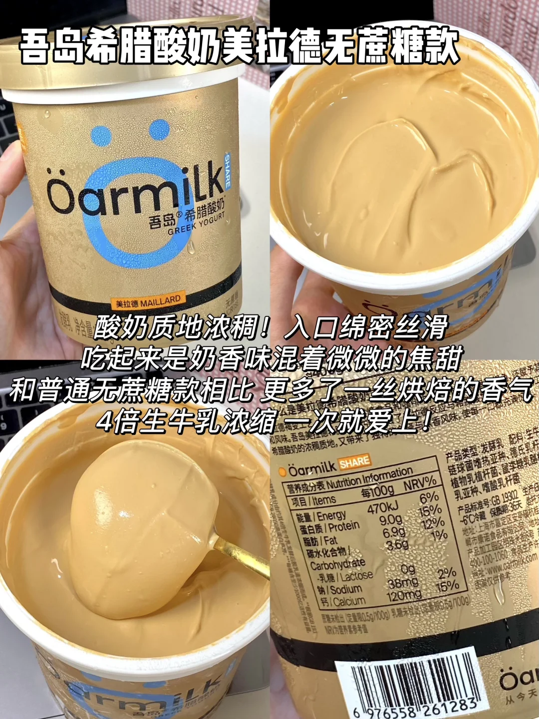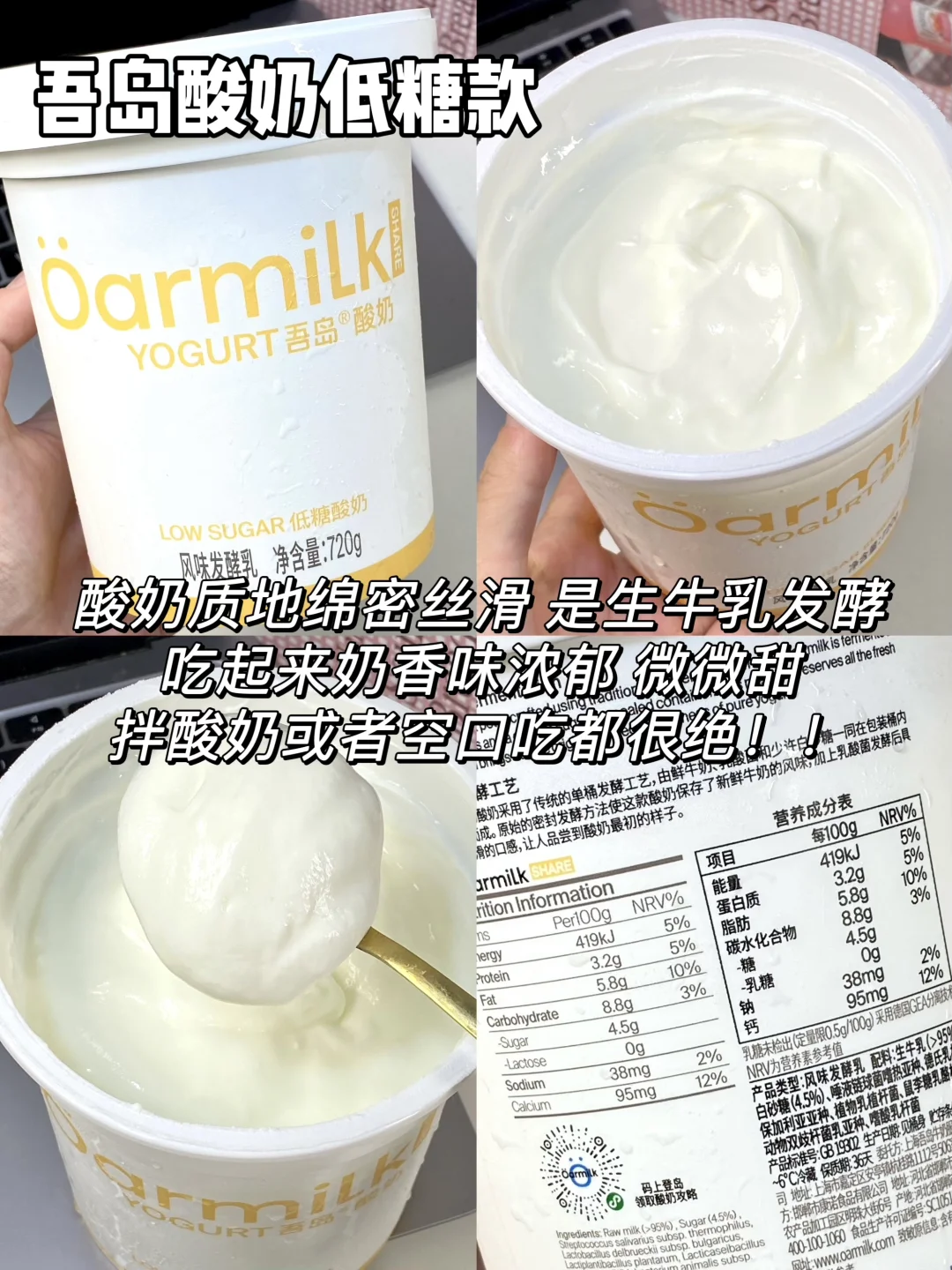 最近超火的吾岛酸奶直接all in了整个系列 今天从口感、热量、配料三个方面给大家测评下 喜欢喝酸奶的姐妹一定不要错过咯 - 1⃣️吾岛希腊酸奶零脂无蔗糖款 热量:63kcal/100g 蛋白质:11g/100g 配料:99%生牛乳+6种有益菌,0⃣️蔗糖0⃣️乳糖配料超级干净,低热高蛋白 2⃣️吾岛希腊酸奶无蔗糖款 热量:116kcal/100g 蛋白质:9g/100g 配料:99%生牛乳+6种有益菌,0蔗糖0乳糖,配料很干净,没有乱七八糟的添加 3⃣️吾岛希腊酸奶美拉德无蔗糖款 热量:112kcal/100g 蛋白质:9g/100g 配料:99%生牛乳+6种有益菌,0蔗糖0乳糖 4⃣️吾岛希腊酸奶低糖款 热量:132kcal/100g 蛋白质:8.6g/100g 配料:生牛乳+6种有益菌,加了白砂糖,入口微甜 5⃣️吾岛酸奶低糖款 热量:100kcal/100g 蛋白质:3.2g/100g 配料:95%生牛乳+4.5%白砂糖+6种有益菌,0乳糖 6⃣️吾岛酸奶无蔗糖款 热量:83kcal/100g 蛋白质:3.4g/100g 配料:99%生牛乳+6种有益菌,0蔗糖0乳糖 7⃣️吾岛希腊酸奶饮用型无蔗糖款 热量:81kcal/100g 蛋白质:7g/100g 配料:99%生牛乳+6种有益菌,0蔗糖0乳糖 8⃣️吾岛希腊酸奶饮用型低糖款 热量:90kcal/100g 蛋白质:6.8g/100g 配料:生牛乳+白砂糖+6种有益菌,0乳糖 9⃣️吾岛芭乐酸奶 热量:92kcal/100g 蛋白质:3g/100g 配料:生牛乳+6种有益菌+真实果肉果酱,0乳糖 - 由于吾岛家多了过滤乳清的步骤 因此他家的酸奶相比普通酸奶会更加浓稠 同时蛋白质含量也会更高~ 而且吾岛全线都是0⃣️代糖0⃣️乳糖的 乳糖不耐受的姐妹也可以放心喝!