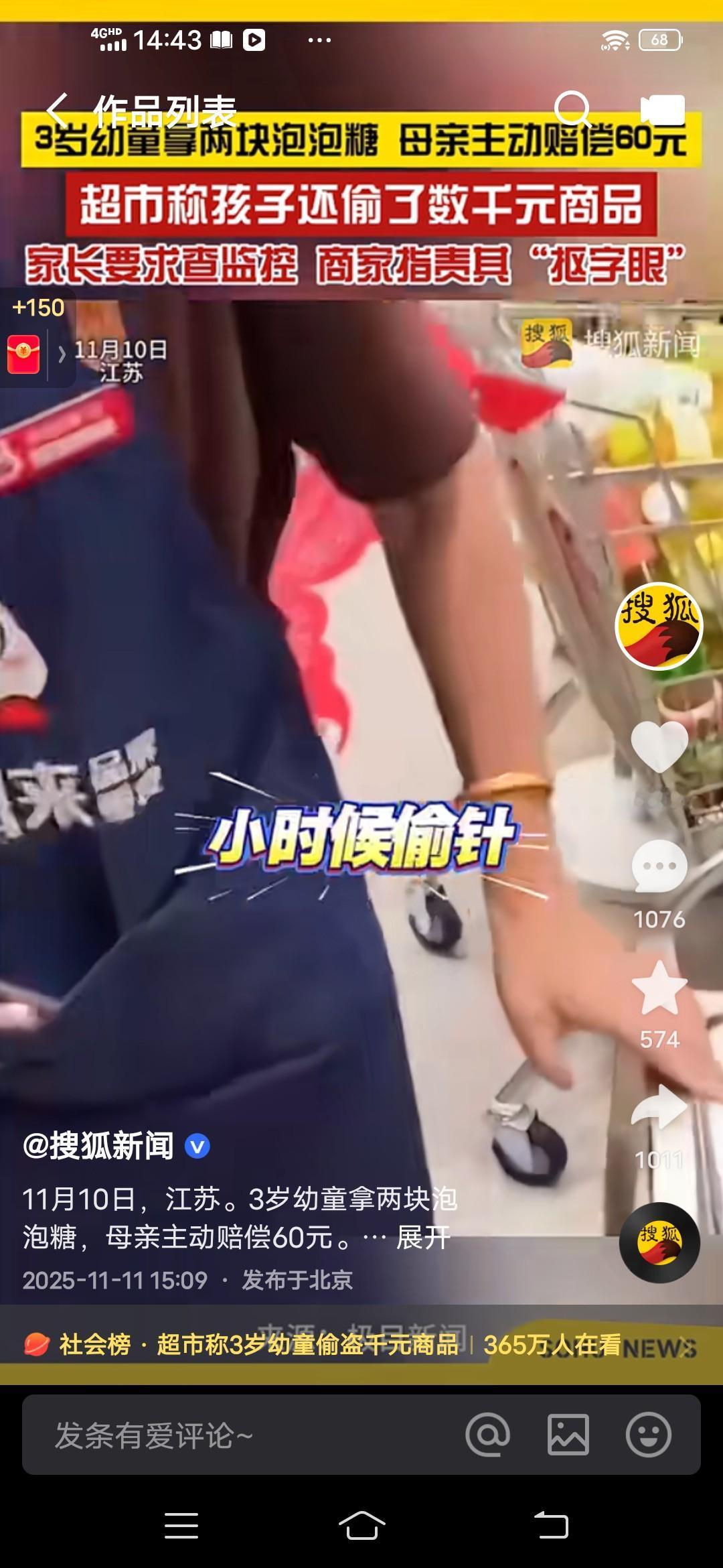 也真是醉了!三岁孩子只是拿了两块泡泡糖,结账时被店家发现,孩子母亲主动提出赔偿60元钱。谁知,店家竟说,这孩子还偷了数千元的东西呢! 这事发生在江苏,11月10号这天,一女子带孩子去超市购物,当她结完账,店员却不让她们走。 原来,店员发现孩子手里拿着两块泡泡糖没被计算在内,按照规定,这属于盗窃行为,必须十倍罚款。 女子二话没说,主动掏出60元钱递了过去。但店员却还是不放她们离开。 店员说,店里还少了几千元的货呢,让她一并结算了。这下女子不干了,要求查看一下监控,如果真发现是自己孩子拿的,愿意照价赔偿。 听店家这样说,女子家人立刻要求查看录像监控,说,如果有真有证据,可以按法律10倍赔钱。 但店员并不肯拿出监控,说她这是在较死理儿。 对此,有的网友评论说,3岁孩子估计还不知道什么叫偷,给娃扣这么大帽子,估计不是店员监守自盗吧。 有的网友评论说,都是有孩子的人,要是我的话,二话不说直接报警,连一块钱我都不赔。 据视频显示,这是一家食品连锁店,上面管理人员已经在处理此事。 咋想的呢?三岁的孩子能偷几千元的货?这理由也太牵强了吧。