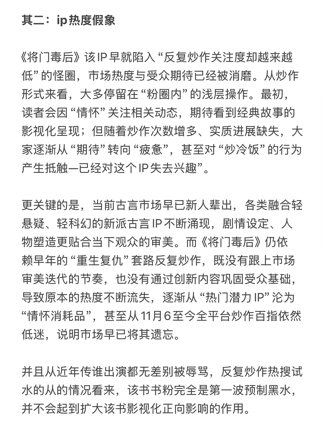 王鹤棣粉丝针对将门毒后影视化再次发表长文,表示“拒绝无休止的炒作、无底线的拉踩、