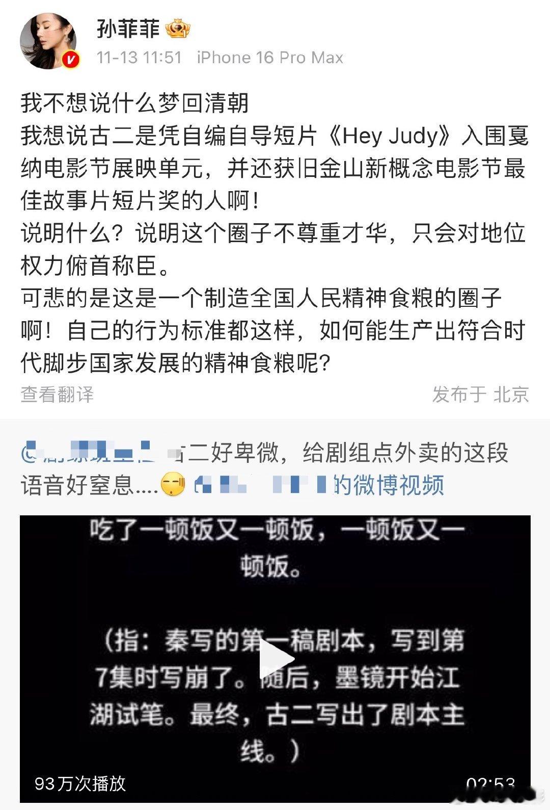 孙菲菲为古二发声!刚刚,孙菲菲连发两条微博力挺古二。此前,古二曝光多条疑似繁花剧组录音引发网友热议。