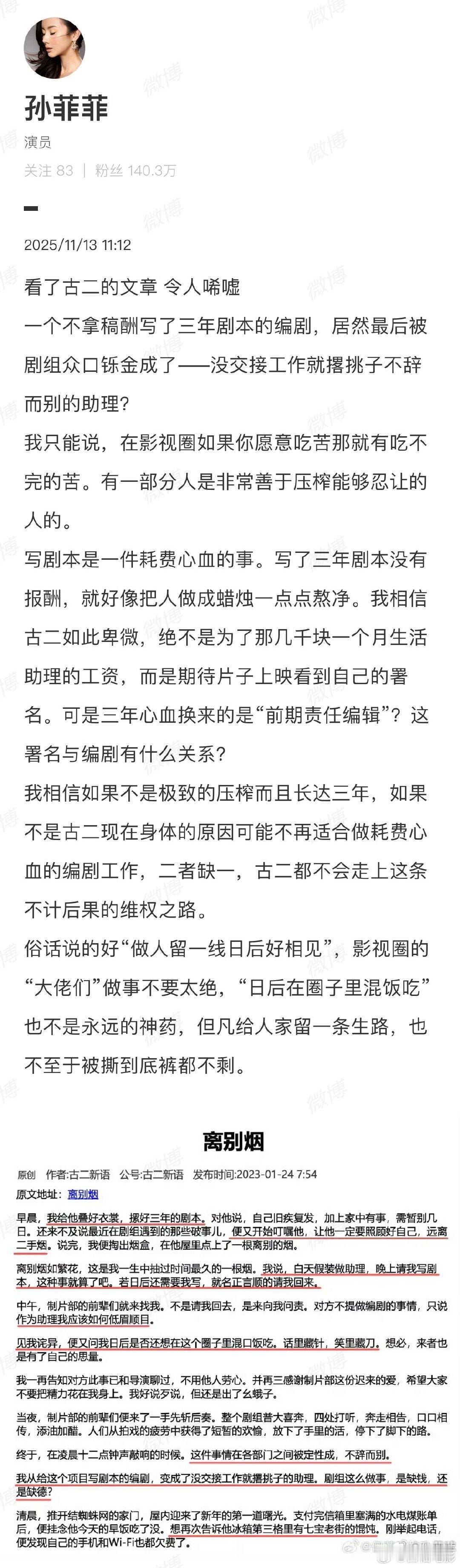 孙菲菲为古二发声!刚刚,孙菲菲连发两条微博力挺古二。此前,古二曝光多条疑似繁花剧