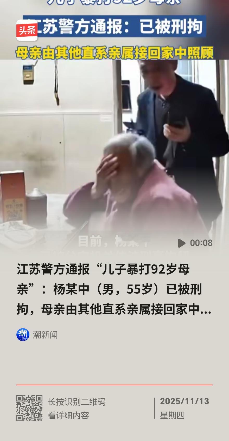 刷新底线!江苏55岁男子暴打92岁母亲,央媒怒批,刑拘结局大快人心 江苏常州一段监控视频引爆全网,55岁男子杨某因92岁母亲索要饭钱,竟当众拳打脚踢,暴行令人发指。 监控画面触目惊心。饭点时分,老人面前空无一物,饥饿之下向儿子要钱买吃的,杨某瞬间暴怒。一记耳光扇得老人踉跄,他再拽住老人花白头发撕扯,拳头脚掌如雨点般落下。老人被打翻在地蜷缩不动,哭声渐弱,杨某却打累了便坐回桌边,若无其事继续吃饭。这段视频是老人女儿所拍,长期目睹母亲遭欺负,此次暴行让她忍无可忍选择曝光。 事件发酵后,网友怒火如岩浆喷发,纷纷呼吁严惩。央媒直接下场痛批,斥责杨某“禽兽不如”,称其行为击穿道德与法律双重底线,明确打妈绝非家务事,而是触碰社会红线的恶行。 舆论沸腾不足24小时,常州警方迅速行动,11月12日将杨某刑拘。调查中杨某起初嘴硬,抱怨母亲“不听话”“添麻烦”,直至面对监控铁证才低头认错,辩称“一时冲动”。 如今杨某工作告吹,社交圈彻底“社死”,亲情裂痕无法弥补。法律的严惩是必然,道德的谴责更会如影随形。敬老孝亲是做人根基,如此施暴行径怎能容忍?你认为该如何遏制此类恶行?评论区留下看法!广东老人被打 殴打中风老人