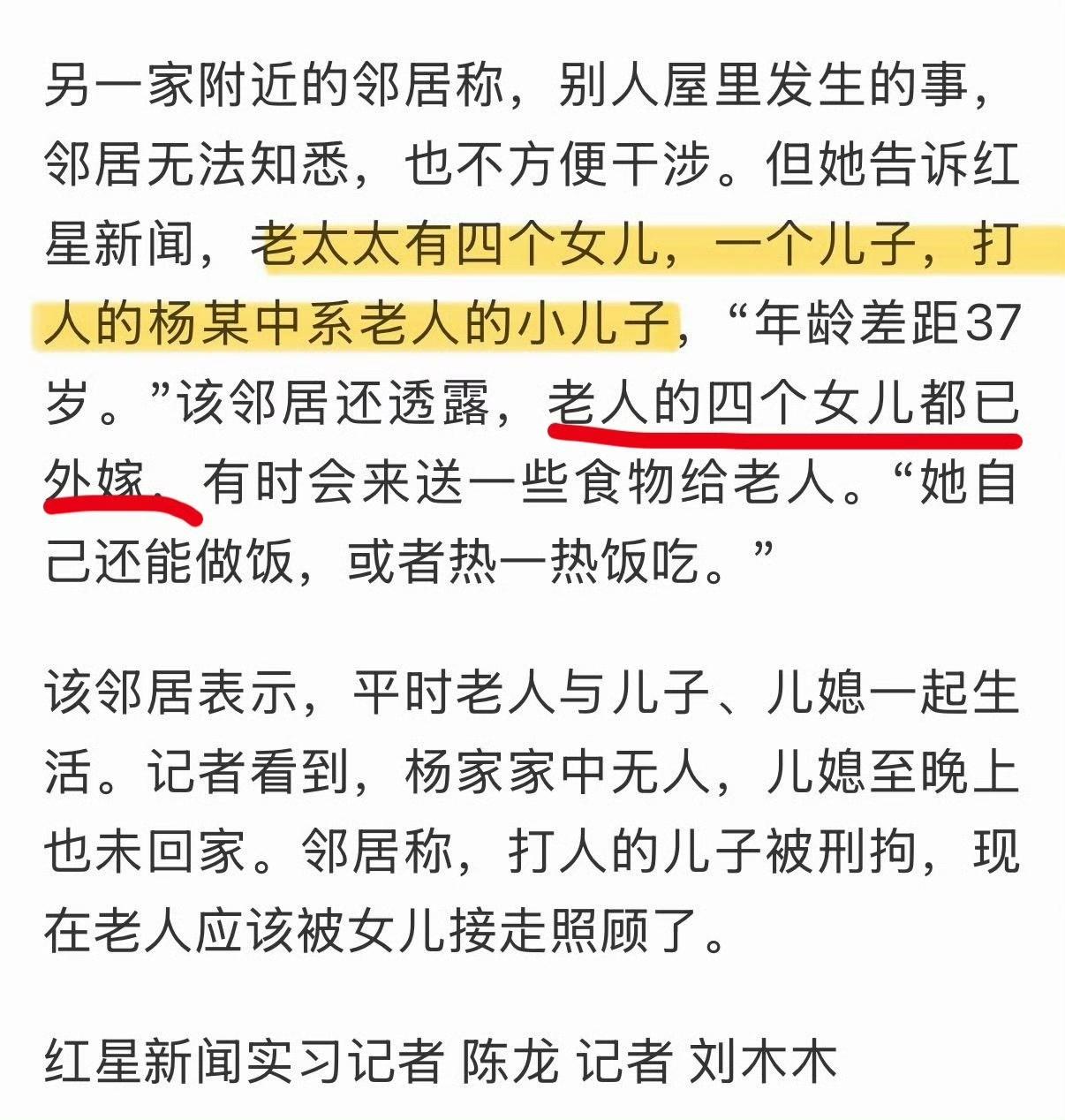 殴打9旬老人的后续:邻居称被儿子殴打老人有4个女儿。 老人有四个女儿一个儿子。 37岁生子,估计儿子从小就娇的很。 有一点不意外的是房子拆迁来的,四个女儿外嫁,儿子自然要养老。 这是太经典的传统模式了,久病床前无孝子。 看到这个信息除了一声叹息,更是养老问题的核心议题,需要社会保障继续加强和改善。