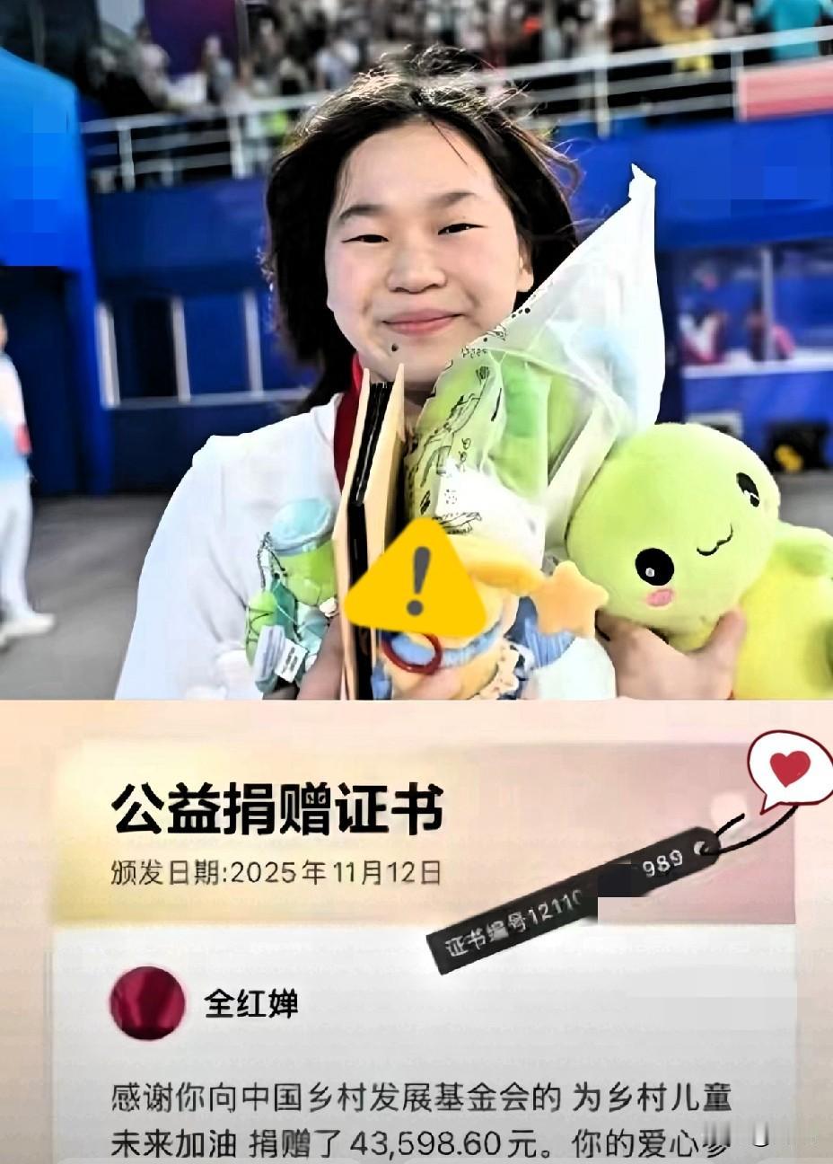 你们发现没有? 全红婵这波操作哪里是“高人指点”, 分明是刻在骨子里的善良本能! 18岁的姑娘,刚结束带伤作战的全运会,一场直播赚了43598.6元,转头就全捐给了乡村儿童,还晒出了捐款证明。 要知道她自己来自普通农村,曾经为了给妈妈治病拼命训练挣钱,如今功成名就,却没忘了那些和曾经的自己一样需要帮助的孩子。 她连直播福袋都要请教队友,哪懂什么流量套路?这份纯粹的善意,比任何刻意设计的“人设”都动人。 真正的榜样从不是装出来的,而是吃过苦仍选择善良,站得高仍记得低头帮扶。你被婵妹这份不加修饰的大爱戳中了吗?