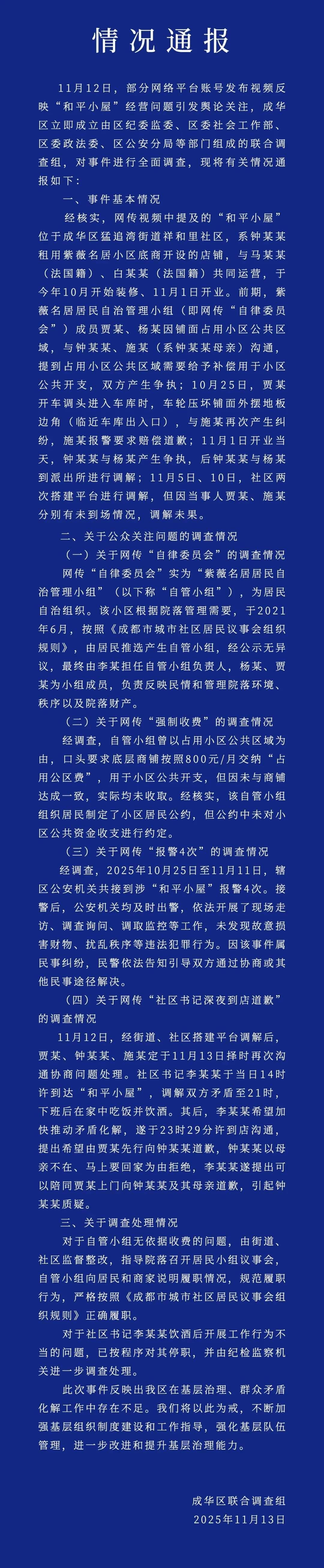 成都通报了“和平小屋”经营问题调查情况 具体的内容实在太多了, 我来根据自己的见解,让大家去梳理一下几个重要的点。 1.事件的基本情况 “和平小屋”据说这个店铺占用到小区公共区域,所以所谓的自律委员会就来沟通,让他们补偿。用于小区的公共开支,然后估计是没谈妥,期间就多次的次发生争执。 2.这个自律委员会实为紫薇民居居民自治管理小组,管理小区院落,类似于业委会这种。 3.强制收取800元每月的费用,实质上还没有收取,而且貌似没有对资金收支有进行约定。 4.经调查,10月25号到11月11号。公安机关接到报警四次,都依法及时出警,但协调未果。 民警依法告知,引导双方通过协商或者其他民事途径解决。 5.关于书记深夜到到店道歉也作了说明。书记曾调解未果,酒后深夜仍坚持调解,本意是想加快推动矛盾化解,没想到却引来了质疑。 6.调查的情况处理。 对于自管小组无依据的收费问题,由街道社区监督整改。 对于书记的话,酒后开展工作已按程序停职,并让他接受进一步的调查。 事件就是这么个事件,我想说如果换做是普通人开这个门店如果遇到这种事情,该协商还是得去好好协商,但是得依法协商。 然后针对这个事件还有一定的特殊性,就在于这个和平小屋所展示的是抗战时期的一些真实照片,对于历史有着重大的意义。 如果说社区能了解到这个点,能够在这方面给予更多的协调和帮忙,可能会更好点! 大家觉得呢?