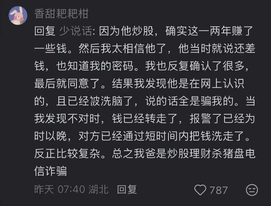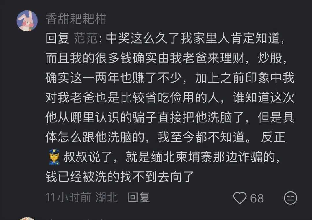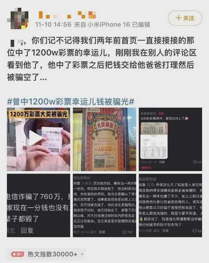 “以为是改变命运的幸运,没想到是一场空欢喜。”近日,网名为“@香甜耙耙柑”的网友爆料,自己2023年中得1200万体彩大奖,税后960万奖金却在两年内散尽,如今全家6张银行卡余额合计不足百元,引发全网热议。随着记者调查深入,这场“暴富变返贫”的离奇遭遇逐渐浮出水面。 爆料帖中,“@香甜耙耙柑”讲述了这场跌宕人生:2023年1月,他凭借一张15元的彩票中得1200万大奖,税后960万奖金到账后,将其中760万交由有炒股经验、生活节俭的父亲老兰打理,自己留存200万。未曾想,这份“天降财富”早已被诈骗团伙盯上——对方以“高收益理财”为诱饵,通过一个多月的话术洗脑,让老兰深陷“杀猪盘”骗局。被深度操控的老兰不仅对家人隐瞒实情,还利用知晓儿子银行卡密码的便利,以“投资缺口”为由多次转账,累计将760万元转给境外诈骗团伙。 等“@香甜耙耙柑”察觉账户异常紧急报警时,诈骗资金已被快速转移洗白、分散藏匿于境外,追讨难度极大,基本“血本无归” 。而他自己留存的200万,也因中奖消息传开后难以拒绝亲戚朋友的借钱请求,累计借出130多万元,如今大多要不回来,甚至有人翻脸直言“你那么多钱还惦记这点”,让他寒心不已。 为核实事件真伪,记者联系上当年开出大奖的武汉体彩店陈老板。陈老板证实,2023年1月该店确有一位兰姓中年男子中得1200万大奖,此人在铁路系统工作,当时距退休仅剩半年,儿子在武汉光谷上班。中奖后,老兰父子确实在武汉光谷购置了一套价值约300万元的房产,与网友晒出的购房合同信息完全吻合 。 在陈老板印象中,老兰“做事非常谨慎”,每次买彩票都会带走票据,从不轻易留联系方式,“实在不像会遭网络诈骗的人”。但她透露,前不久偶遇老兰时,发现他“比过去憔悴许多”,神情状态大不如前,这让“巨款被骗”的爆料更添几分可信度。截至发稿,记者多次尝试联系“@香甜耙耙柑”未果,武汉反诈中心相关咨询电话也未能接通,暂无官方对诈骗事宜的明确回应。 如今,老兰父子已回归普通人的生活,照常上班、偶尔仍会购买彩票,仿佛那场轰动一时的富贵梦从未发生。但从税后960万到余额不足百元的巨大落差,足以成为所有人的警示:“高收益理财”“内部投资渠道”等说辞多为诈骗陷阱,境外诈骗更是资金追回难度极大 ;面对突如其来的财富,既要守住“不轻信、不转账”的防诈底线,也需理性应对人情往来,避免因盲目借贷造成损失 。幸运从来不是人生的保险箱,驾驭财富的认知与定力,才是长久幸福的根基。