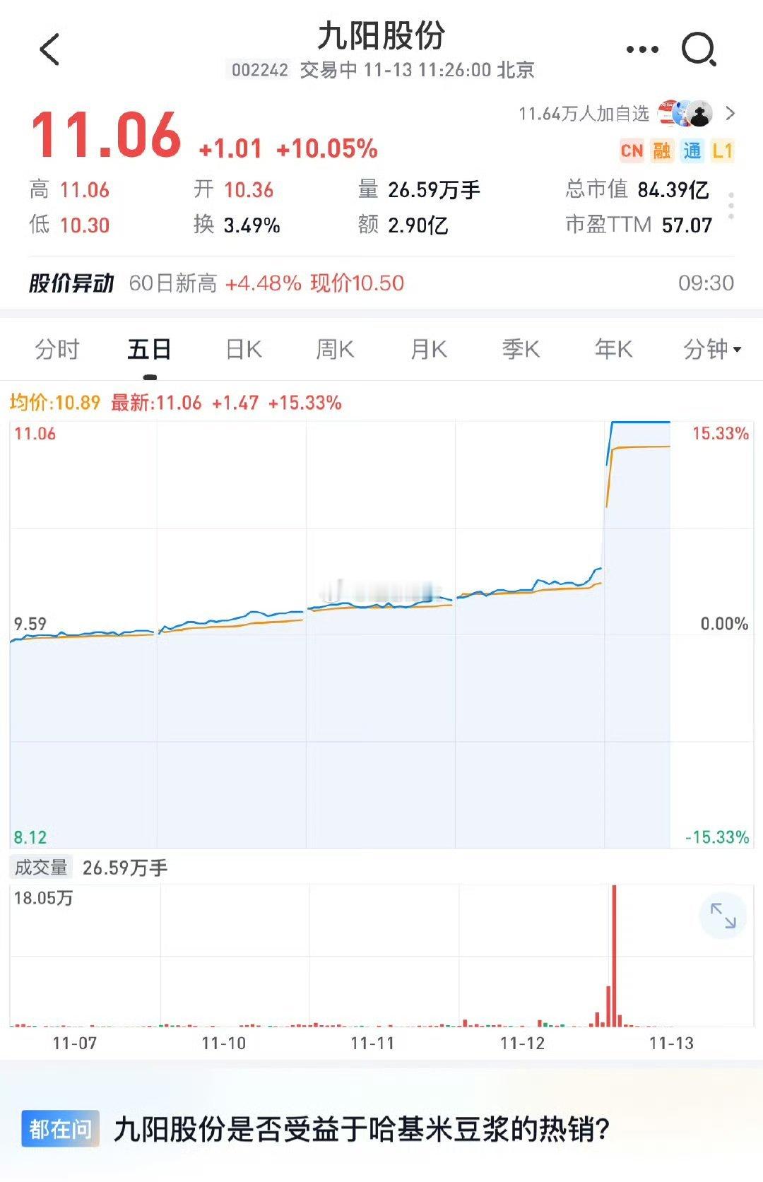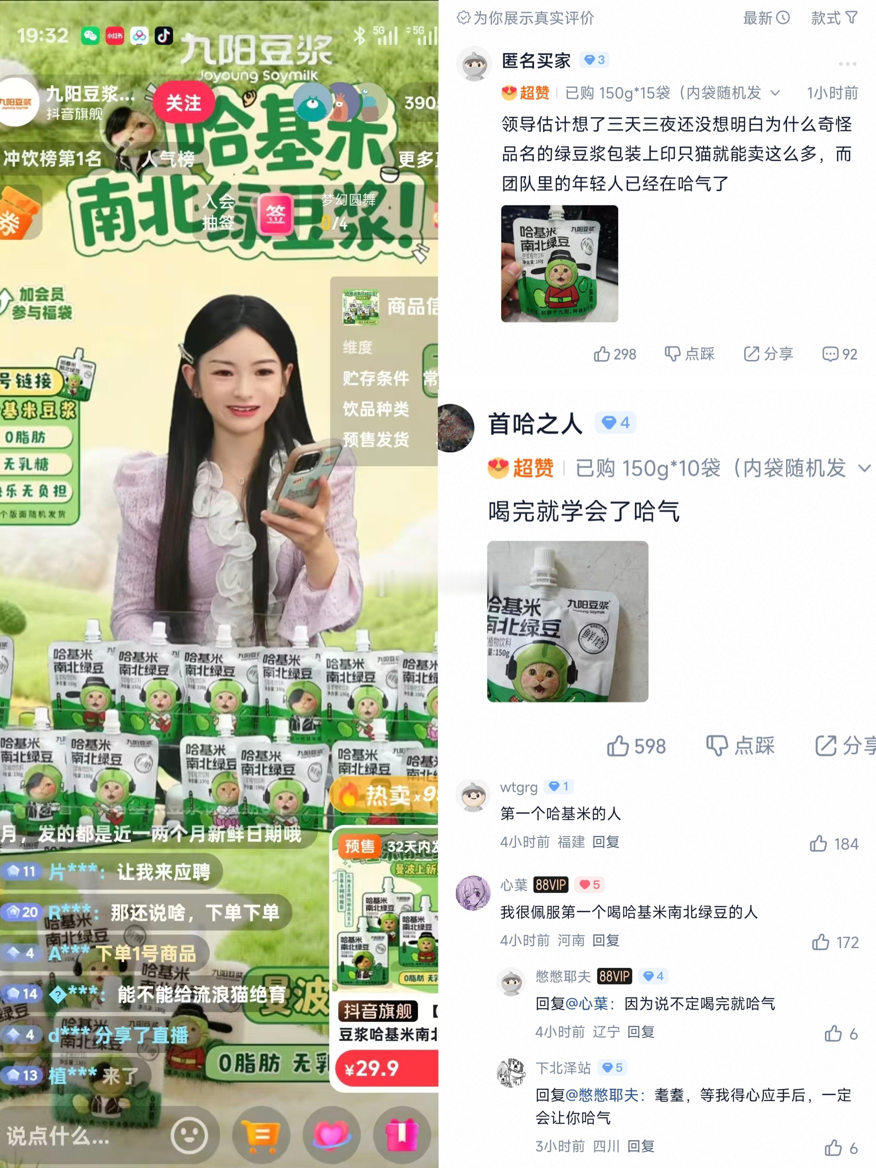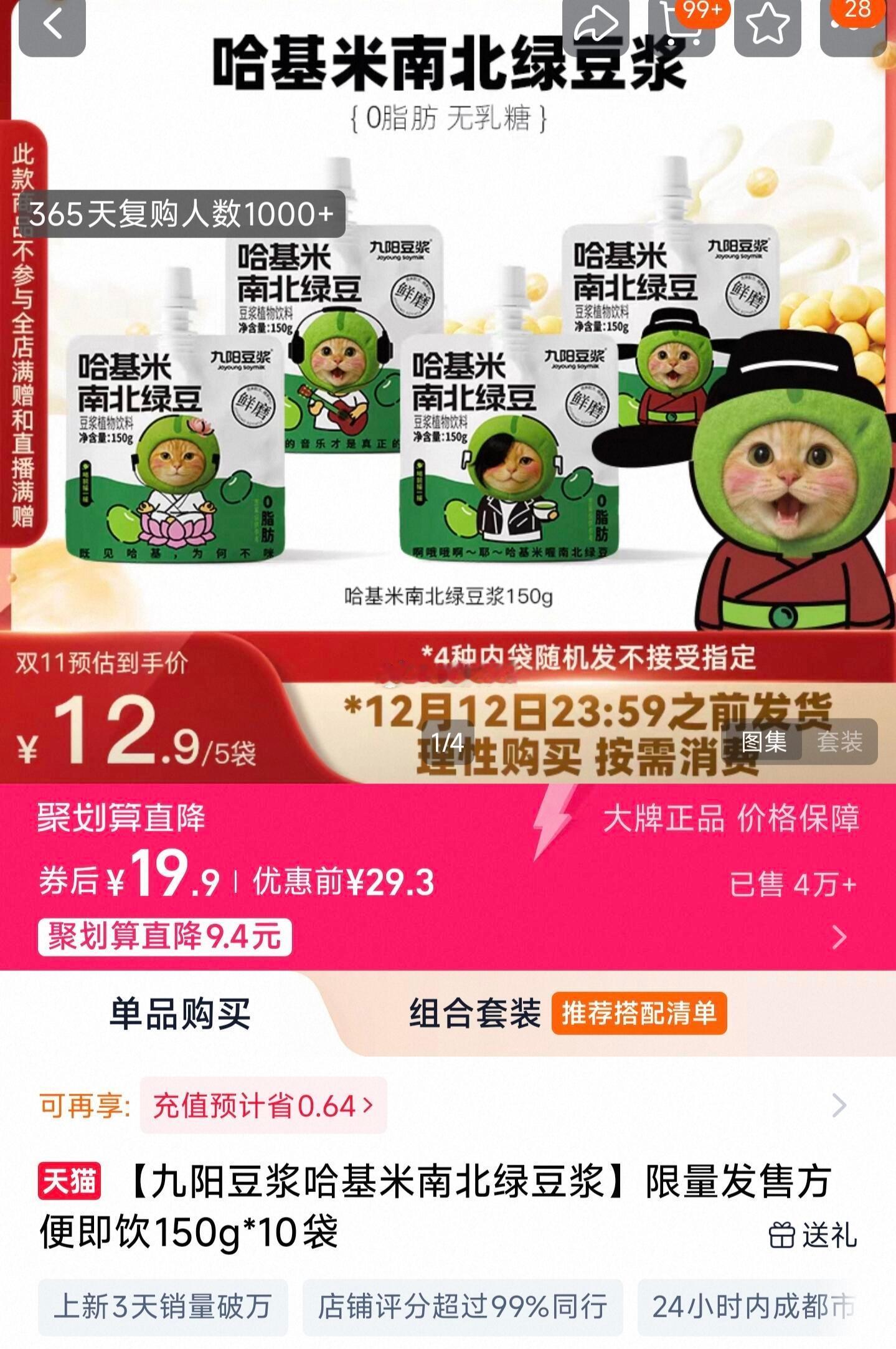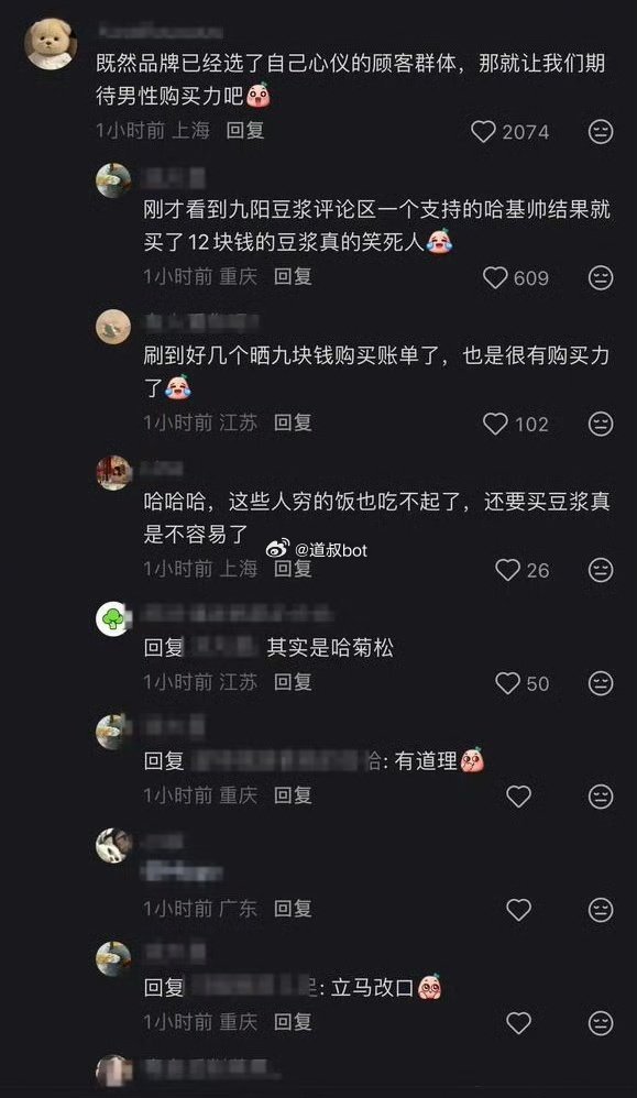 九阳推出哈基米南北绿豆浆,把爱猫人士给急得破防了,导致九阳股票直接涨停,而且销量很好。