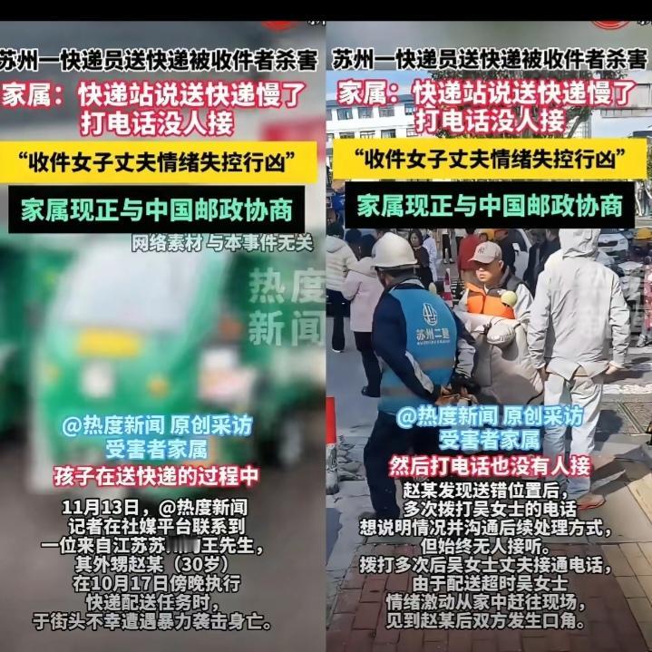 就因为送错快递,江苏一快递员被残忍杀害! 事情是这样的。因为定位偏差,30岁的邮政快递员小李,把快递误投到距吴女士家几百米的驿站处,发现错误后,小李多次拨打其电话都无人接听,后终于联系到吴女士丈夫 但是吴女士却因配送超时情绪激动赶往现场,双方发生口角后,其丈夫突然持刀行凶,小李因失血过多身亡。 有人说,快递员真的惨,配送超时不仅要被罚款,还送了命。也有人说,不是一家人,不进一家门,这两口子都是一类人,不把快递员当人看。 依我看,得饶人处且饶人,多一点理解和包容,可能很多惨案都不会发生。 几百米的距离,一件无心的失误,本该几句话就能说清的事儿,最后却酿成人命惨剧,想起来就让人心里发堵。快递员风里来雨里去,为了不罚款拼着时效送货,定位偏差又不是故意为之,多给一分钟解释的时间,何至于走到这一步? 生活里谁还没个犯错的时候,你退一步体谅,我多一句道歉,矛盾往往就化解了。那些把服务行业当“出气筒”的人,忘了大家都是为了生活奔波的普通人,尊重从来都是相互的。少点戾气,多点共情,别让小事升级成无法挽回的悲剧。各位读者你们怎么看?欢迎在评论区讨论。