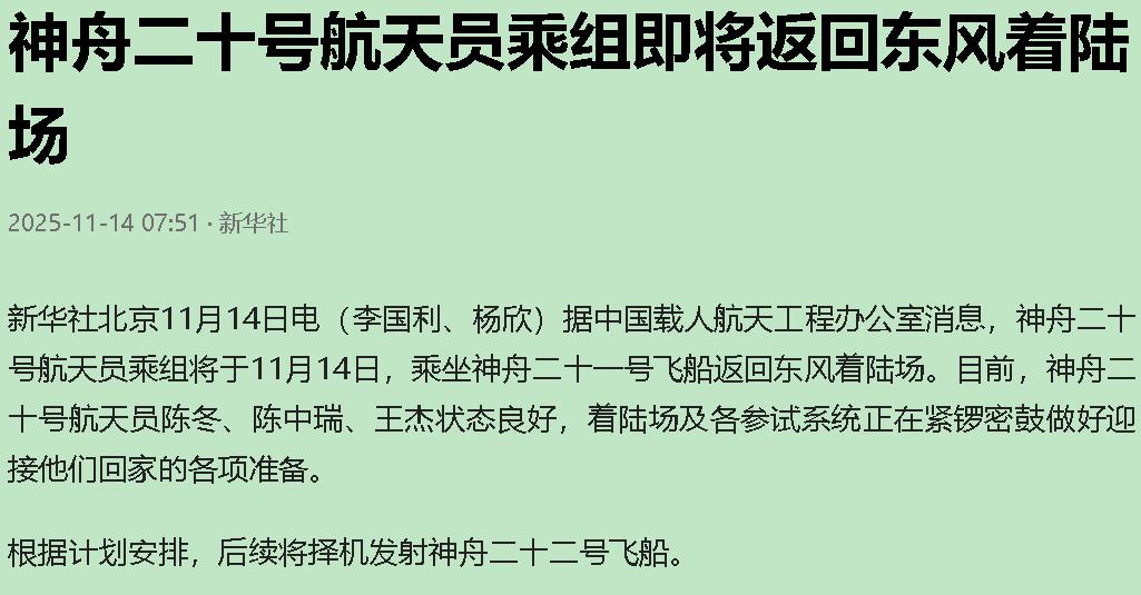 你知道吗?太空里一粒指甲盖都不到的碎片,差点让三位航天员回不了家。 那天,神舟二十号像往常一样在轨道上安静运行。突然,“砰”一声闷响从舱外传来——像是谁用石子敲了下铁皮罐头。这声音很轻,却在寂静的太空中格外清晰。 陈冬下意识看了眼舷窗。窗外,星星依旧安静地闪烁,仿佛什么都没发生。但警报灯亮了。 后来才知道,是一粒毫米级的金属漆屑惹的祸。它在太空中以每秒7.6公里的速度飞行——这个速度,让一粒沙子都有了子弹的威力。 地球轨道早就不是净土了。记得小时候看星星,总觉得夜空纯净得像洗过一样。现在,同一个轨道高度上飘着至少3.5万个可追踪的碎片,还有上亿个看不见的“隐形杀手”。它们不会自行消失,只会不断碰撞,制造更多碎片。 就像你把一罐玻璃珠倒进房间,再也捡不干净。 但中国航天有备而来。 “启动备用飞船。”地面指令简短有力。停在空间站旁的神舟二十一号随即进入待命状态。这不是临时起意——从神舟十二号开始,我们就有了“一船发射、一船待命”的规矩。 就像你出门总会带把备用钥匙,虽然希望永远用不上。 这套“双保险”让西方同行羡慕。美国的载人龙飞船要准备好几个月,俄罗斯的联盟号也做不到这么快的反应。而我们,永远有艘“热备胎”随时能点火启航。 今晚,三位航天员将乘坐神舟二十一号回家。他们的原座驾神舟二十号,可能会独自完成一次无人返回。想到这,心里有点不是滋味——那艘载他们上天的飞船,现在却要孤零零地返航。 更多的是庆幸。庆幸我们有备选方案,庆幸航天员能平安归来。 那道划过飞船的微小轨迹,像极了命运给的提醒:在太空这片未知海域,再小的浪花都可能翻船。而我们能做的,就是永远多准备一条救生艇。 现在,神舟二十一号正调整姿态准备回家。三位航天员系好安全带,舷窗外地球的轮廓越来越清晰。 他们知道,地面上有无数人在等待。而太空中,那艘被“冷枪”击中的神舟二十号,将继续它的故事——或许会成为最特别的无人返回舱,在人类航天史上写下新的一页。 这粒小小的太空碎片,让我们看清了:探索宇宙从来不是浪漫的童话,而是实打实的冒险。但只要有充分的准备,再险的路也能走成坦途。