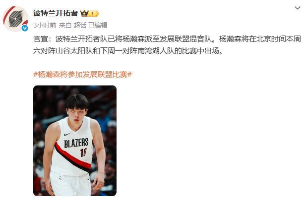 官宣:波特兰开拓者队已将杨瀚森派至发展联盟混音队。杨瀚森将在北京时间本周六对阵山谷太阳队和下周一对阵南湾湖人队的比赛中出场。 此前开拓者让杨瀚森到发展联盟仅仅是参加训练,因为开拓者队目前比赛紧张,球队基本都是以恢复性训练为主,作为菜鸟,杨瀚森已经连续六场比赛没有能登场。所以他的训练肯定不是恢复训练那么简单,而是各种强化训练,包括速度、对抗、体能等各方面都需要提高。 现在杨瀚森算是正式被下放到发展联盟,因为他不仅要参加发展联盟的训练,还要参加发展联盟的比赛。 对于杨瀚森来说,这其实是一个更好的选择,在开拓者队,他现在根本没有机会参加比赛。这对他来说的确影响了进步和提高。 到了发展联盟,杨瀚森至少能参加正式比赛。有比赛才能真正提高,真正适应NBA的比赛节奏,真正体会到场上的力量对抗。 但发展联盟对于杨瀚森也是一个挑战,毕竟发展联盟里,球员打得会更独,战术配合会更简单化。很多球员和杨瀚森一样,都是到发展联盟蛰伏提高寻求一线队机会的,所以他们更想展现自己。 杨瀚森作为一名内线球员,特别是这种指挥型内线球员,如果手里没有球权,其实到任何联盟到任何球队都很难有发挥的机会。你让现在的约基奇当菜鸟来到开拓者,他也不会有好的发挥,因为球权大都集中在那些锋线和卫线手里。你就只能变成蓝领内线。防守抢篮板,肉搏战。 所以发展联盟对于杨瀚森是什么定位很重要,如果像夏联、季前赛那样,杨瀚森手里有一定球权,他应该不会像在一线队那么困难。 但话说回来,如果杨瀚森在力量对抗等方面没有提高,打发展联盟他也会很困难。 所以真到了发展联盟,机遇和风险应该是共存的,因为如果发展联盟都打不明白,杨瀚森在NBA的前景就会暗淡了。