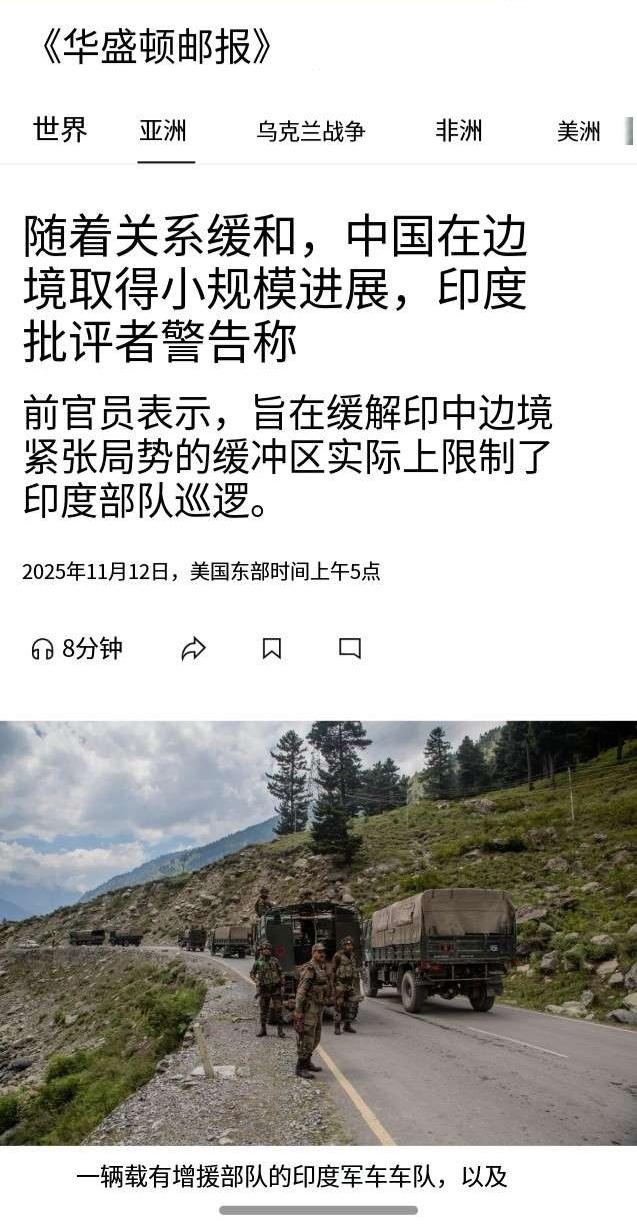 中印直航重启,边境谈判推进,关系眼看着一天天回暖。可有些人就是看不得别人好,美媒的“酸葡萄心理”又发作了。 《华盛顿邮报》11月12日的一篇文章详细描述了中方对拉达克缓冲区的“侵占”行为,该报称印度已限制其巡逻活动以缓解紧张局势,这实际上使得中方能够更靠近实际控制线。 印度的批评者,包括反对派领导人,认为这相当于中国的领土“扩张”,特别是在靠近巴基斯坦实际控制线的德普桑等地区。 恕我直言,拉达克地区本就是中国领土,中印边境问题是我们两国之间的事,轮不到美媒指手画脚。华盛顿邮报在中印关系回暖的关键时刻跳出来挑拨,分明是见不得两国走近,想给缓和进程使绊子。这种煽风点火的行径,我们早已看得清清楚楚,中印有智慧也有能力处理好自己的事,不需要外人来“操心”!