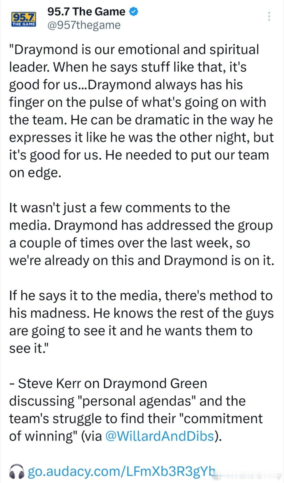 科尔在电台节目中为追梦关于“个人私心和团队目标”的言论解释:“追梦是我们的情感和精神领袖,他说出那种话时,对我们是有益的……追梦总能掌握球队的动向,他表达方式有时会夸张点,就像前几天那样,但这对我们是有好处的,他需要让球队保持警觉。”“过去一周,他已经在内部和队友谈过几次,我们已经在关注这个问题,追梦也在关注。如果他把话说给媒体听,那肯定是有目的的。他知道其他队友会看到这些,他就是希望他们看到。”