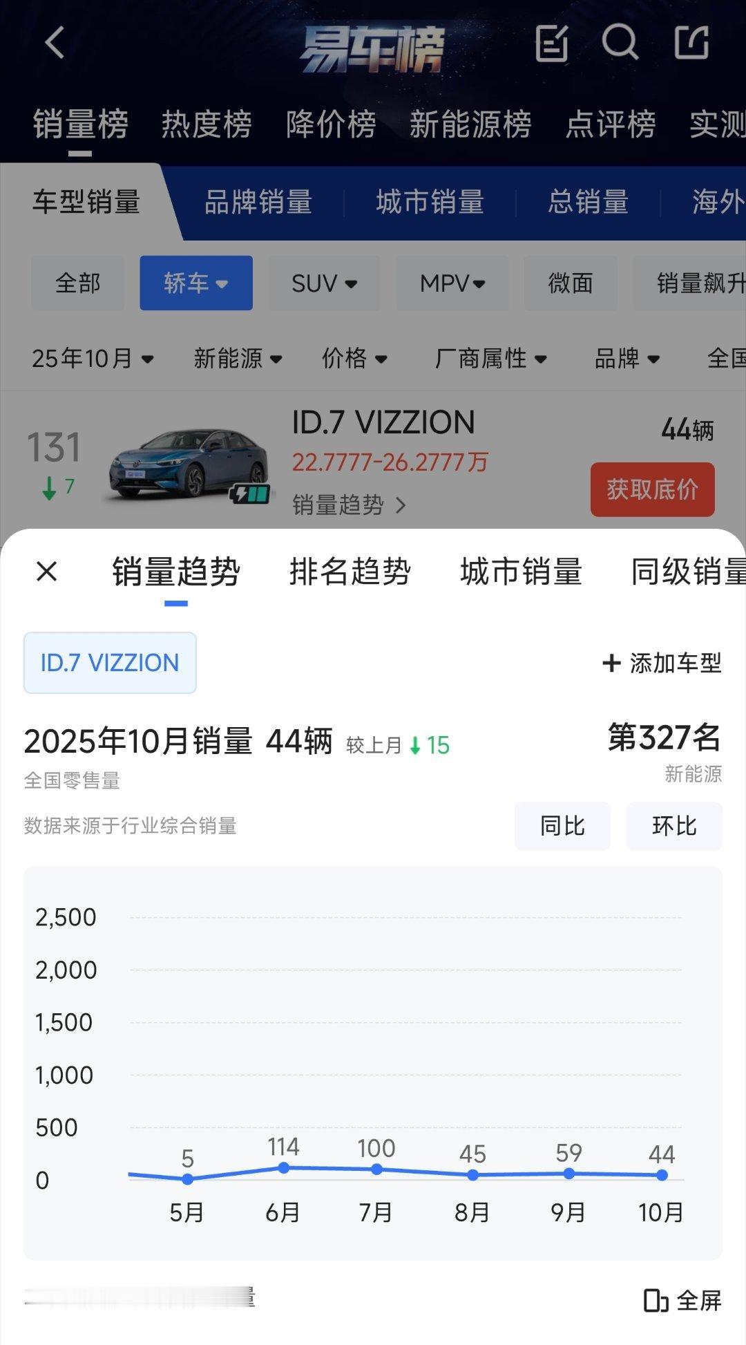 下周广州车展,想着说租个车,然后就发现大众ID.7咋这么便宜?明明是跟海豹同级的车,价格却比海豚还低,很划算啊!一看销量就懂了,上个月大卖44辆,街上见到的白色ID.7估计有一半属于租车公司消费者不认可,说啥都没用~