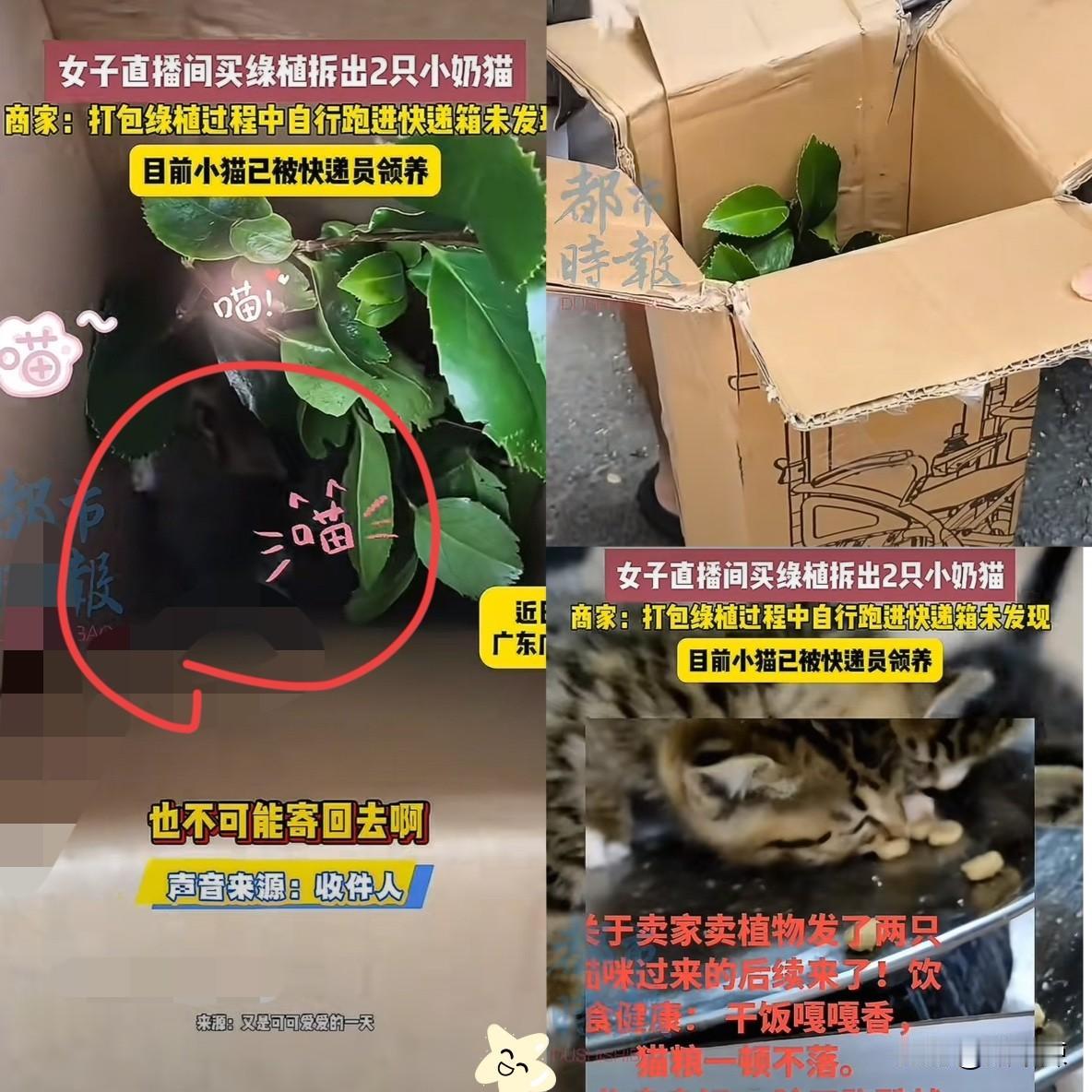 “网购绿植拆出两只奶猫?”广东广州一名女子在网上直播间购买了一株绿植,谁料收到包裹后,居然听到里面传来小猫的叫声 当着快递员的面开箱,两只毛茸茸的小奶猫直接钻了出来,又萌又让人揪心? 商家说大概率是打包时小猫自己溜进去的,可浙江到广州足足两天路程,密闭纸箱里又闷又黑,小猫能活下来纯属命大! 但这事真不是“缘分”能掩盖的,快递明文禁寄活物,商家打包不仔细、快递收寄不验视,这明显是违规操作! 还好快递员心软愿意收养,结局算圆满,可想想就后怕:要是小猫没挺过来,或是运输中出意外,谁来担责? 小猫遇到了有爱心的快递员!