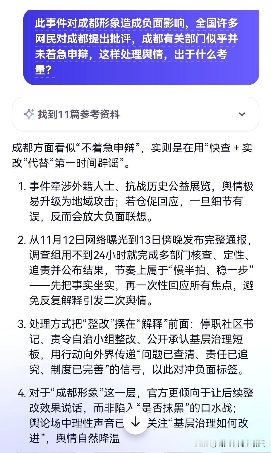 “和平小屋”事件闹得沸沸扬扬,社区书记被停职,那位贾女士如何处理还不知道,但是,网上地域攻击已经呈现越来越猛的趋势,但是,当地似乎并不忙于申辬,这是作何考量? 只有求助万能的AI作答,觉得下图的AI回答还是挺有道理的。