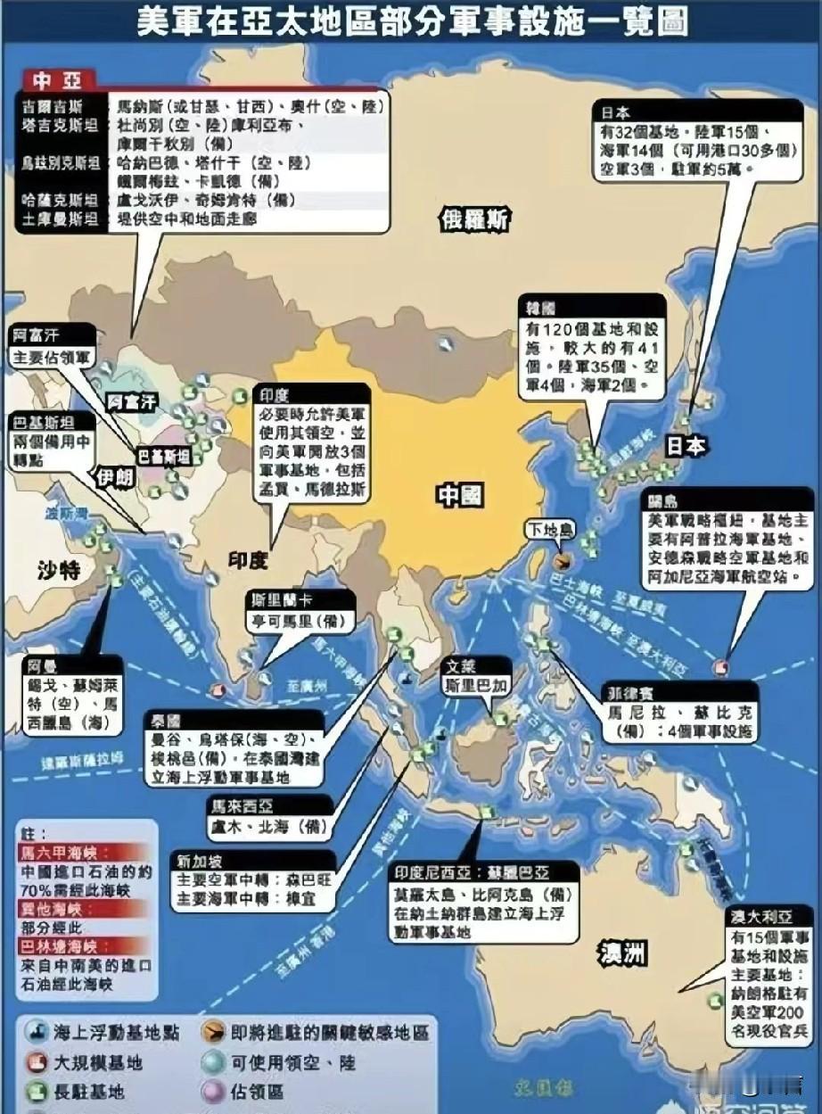 知道美国的军事基地多,但没想到多到这种程度。美国在140多国家和地区拥有军事存在,联合国官方数据,全世界一共才197个国家。相当于3/4都有美国的驻军。 从美军的全球部署,也能够看出其战略布局,主要集中在欧洲、亚太和中东三大区域。 欧洲地区:超过100个基地 ,约8.4万人 。其中,德国是美军在欧洲的最大驻军国 亚太地区:日本约120个基地 ,约5.3万人 ,横须贺基地是美国海军第七舰队的母港 。韩国73个基地 ,约2.6万人 中东地区:卡塔尔,巴林,沙特,伊拉克,科威特等众多海湾合作委员会国家,总人数约4~5万人。 美国的穷兵黩武,让140多个国家主权受损,这种建立在他人隐痛之上的‘安全’,注定不会长久,美国要完蛋了。 美国军事基地 美国全球基地 美军全球驻军 美军地图