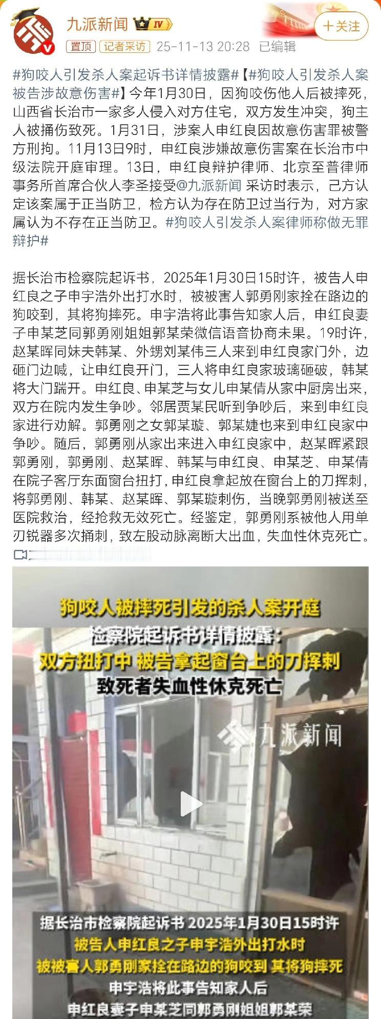 起诉书里提到的人物关系稍微有点乱,我给大家翻译下。 最先进来的3个人,分别是死者妻子赵某某及妹夫韩某、外甥刘某。 这3个人是边砸门,边让被告开门,期间还把被告家的窗玻璃给砸了。 死者外甥韩某把大门踹开以后,与被告及其妻女在院内发生争吵。 邻居这边听到动静后,赶过来调解,没成。 随后,死者的两个女儿也加入战局,随后死者也来了。 被告这边说,对方一共来了9个人,综合报道来看,分别是死者妻子、妹夫、外甥、死者及两个女儿,余下人员不明。 被指控非法入侵住宅罪的,是先进来的3人。 检方认为,被告刺伤死者外甥韩某,属于正当防卫。 看前述起诉书也知道,这家伙叫得最凶,冲的最靠前。 但检方同时认为,被告刺死死者,属于防卫过当。 整体情况大概就是这么回事。
