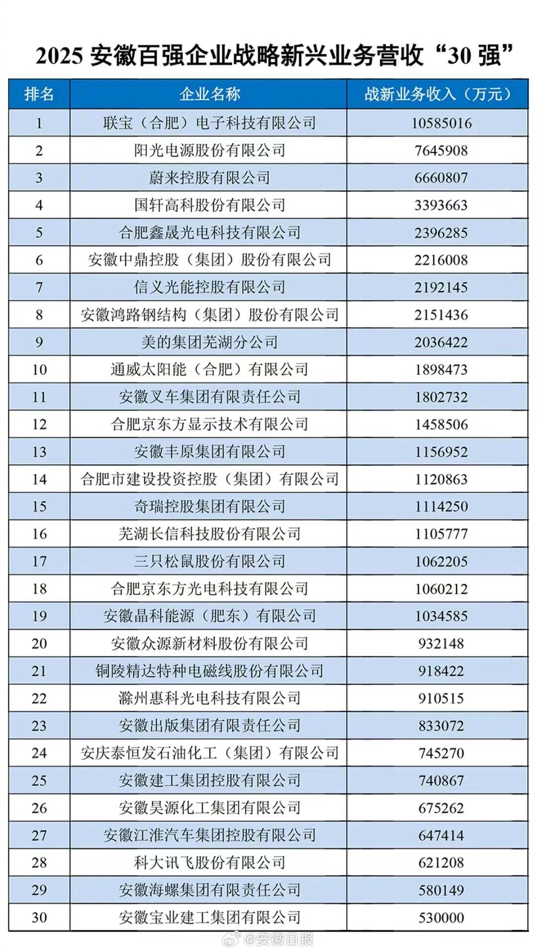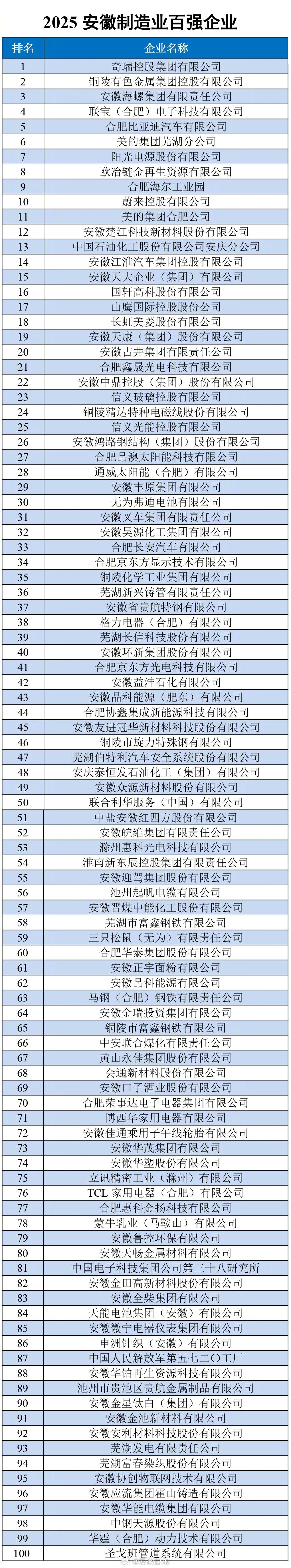 【 ,这些企业入选……】今天下午,2025安徽省百强企业发布会暨企业家论坛在合肥举行,会上发布了2025安徽百强企业、2025安徽制造业百强企业、2025安徽服务业百强企业、2025安徽百强企业战略新兴业务营收“30强”排行榜。其中,奇瑞控股集团有限公司以4295亿元的营业收入分别居2025安徽百强企业、2025安徽制造业百强企业的首位。铜陵有色金属集团控股有限公司、安徽海螺集团有限责任公司分别居第二、三位。安徽省交通控股集团有限公司、合肥百货大楼集团股份有限公司、中国石化销售股份有限公司安徽石油分公司分别位居2025安徽服务业百强企业榜前三位。今年还特别评选了2025安徽百强企业战略新兴业务营收“30强”,联宝(合肥)电子科技有限公司以1058.5亿元的战略新兴业务收入排名榜首。据了解,2025安徽百强企业营业收入总额达到35944.40亿元,与2024安徽百强企业相比,增长了119.09亿元,增长比例为0.33%。数据显示,2025安徽百强企业稳中有进,规模再创新高,入围门槛快速提升,达到83.66亿元,较上年增长5.93%,与全国相比,安徽百强企业入围门槛位列第七(次于浙江、江苏、山东、上海、福建、湖北);制造业活力强劲,创新投入高位增长,平均研发强度达到2.89%,创历史新高;汽车产业与新能源产业规模效益水平继续保持高速增长;民营企业入围数量持续增长,营收指标较上年增长14.5%,首次超越国企;百强企业出海经营纵深推进,海外收入总额增长34.39%,海外资产总额增长37.77%。(安徽日报)