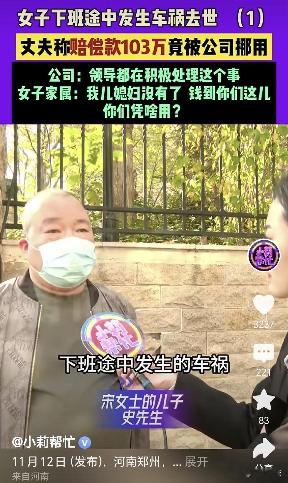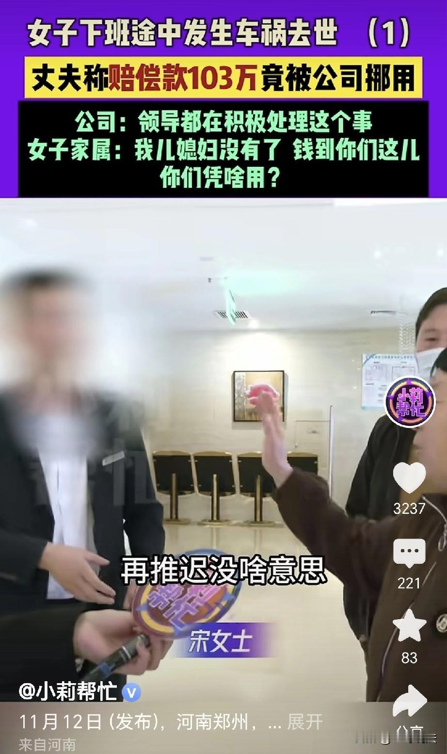 这种钱也敢动?河南郑州,一女子在酒店工作,回家途中出车祸去世,女子被认定工伤,经过核算,赔偿款103万,谁知这笔钱被打到了酒店账上,家属等了一个多月,酒店只给了40万元,剩下63万元,被酒店挪用到其他用途,女子婆婆在酒店大哭: 我儿媳妇没有了,钱到你们这儿,你们凭啥用? 史先生心力交瘁,妻子突然意外去世,家里乱做了一团,没想到后续工亡赔偿款又出了岔子。 103万的赔偿只拿到40万,剩下的钱被妻子所在的酒店给挪用了,史先生无法接受,找来记者想得到帮助。 史先生告诉记者,自己的妻子在酒店上班,10月14号那天,她像往常一样下班回家。 可是万万没有想到,妻子骑车时遭遇到了事故,被紧急送往医院抢救。 虽然医生用尽了全力,还是没能留住她的生命,妻子在医院治疗了37天后,最终还是遗憾的离世。 好好的人说没就没,史先生家里陷入了困境,天仿佛塌了,家里有老人和孩子,他疲于奔命,一个人忙里忙外,累的憔悴不堪。 处理完了后事,史先生才想起,妻子是在下班途中出的事,按照规定,应该属于工伤,于是他就拿着相关材料,向有关部门申请了工伤认定 经过一段时间的等待,工伤认定结果下来了,妻子的情况确实符合工亡标准。 因为妻子在酒店上班时正常缴纳了工 伤 保险,所以经过核 算,确定了妻子1036420元的工亡待 遇 金。 这笔钱包括了工亡补助金、丧葬补助金等所有该给的费用。 史先生原本以为,社 保 已经核 定了金额,这笔钱就能尽快到账,缓解一下家里的压力。 可是他没想到,赔偿款并没有直接打到他的账户,而是转到了妻子所在的酒店账户上。 史先生也没多想,在他心里,酒店作为用人单位,收到钱后就会尽快转给家属。 毕竟这是人命关天,这笔钱是给予逝者家属亲人的补偿,毕竟逝者已去,生者还要生活下去。 谁知他左等右等,却迟迟不见钱的踪影,他只好主动联系酒店负责人。 酒店的曹总答复他,钱已经打到总公司了,会尽快安排转账。 就这样盼了一个月,史先生才陆陆续续收到了40万转账,剩下的636420元却一直没动静。 他一次次给酒店打电话、跑酒店沟通,已经得不到妥善的处理。 直到后来,酒店负责人才说出实情,剩下的钱被公司挪用了,用来支付其他着急的款项。 史先生又气又急,这不是发财的钱,是我老婆的拿命换的,凭啥他们说用就用? 史先生的母亲更是悲痛欲绝,媳妇生前十分的孝顺,对老人照顾的细微周到。 如今没了儿媳,孩子们没了母亲,史先生还要上班,老人急的睡不着觉。 老人对着酒店哭喊,我儿媳妇都没了,钱到你们这儿了,凭啥不给我们? 家里的开销越来越大,老人要赡养,孩子要上学,妻子治疗和丧葬也花了不少钱。 剩下63万赔偿款,成了史先生心病,他要不来钱,联系了记者请求帮助。 记者接到求助,很快介入,记者陪着史先生和他母亲,一起来到了涉事的酒店时。 酒店方面一开始还在找借口,说公司账户有转账限额,所以没法一次给付清。 可记者当场反问,就算单日限额,一天转10万,10天也该转完了,现在都过去一个月了,为啥只转了40万? 面对记者的追问,酒店负责人哑口无言,最后才承认,中间因为有其他着急的付款,就把这笔赔偿款先挪用了。 在记者的协调下,酒店方面终于松口,愿意和史先生协商解决方案。 当天下午,大概3点40分,史先生收到了酒店签署的承诺书。 承诺书白纸黑字,剩余的636420元工亡补偿金,从2025年11月12日开始,每天向史先生支付10万元,直到11月20日之前全部付清。 看着这份承诺书,史先生心里的石头总算落了一半,希望酒店能说到做到,不要让逝者的家属再失望了。 《民法典》第985条规定: 得利人没有法律根据取得不当利益的,受损失的人可以请求得利人返还取得的利益。 酒店挪用该款项支付自身紧急款项,属于无法律依据获得的利益,史先生有权要求酒店返还这笔款项。 《民法典》第1165条第一款规定: 行为人因过错侵害他人权益造成损害的,应当承担侵权责任。 酒店明知这笔钱是工伤赔偿款,酒店本身具有代收转付义务,却故意挪用,主观上存在过错。 这种挪用,已然侵害了家属的财产权益,酒店需承担返还财产、赔偿利息损失等侵权责任。 《民法典》第3条规定: 民事主体的人身权利、财产权利以及其他合法权益受法律保护,任何组 织或者个人不得侵犯。 酒店将赔偿款转入自身账户后,本应及时转交给家属,却以各种借口拖延,甚至擅自挪用,这种行为本质上是对家属合法财产权利的公然侵犯。 若酒店已经做出承诺,每天归还10万,11月20日之前全部付清。 如果酒店未按承诺书履约,家属可通过诉讼进一步维权。 关注@王哥说法 多学法律少吃亏!