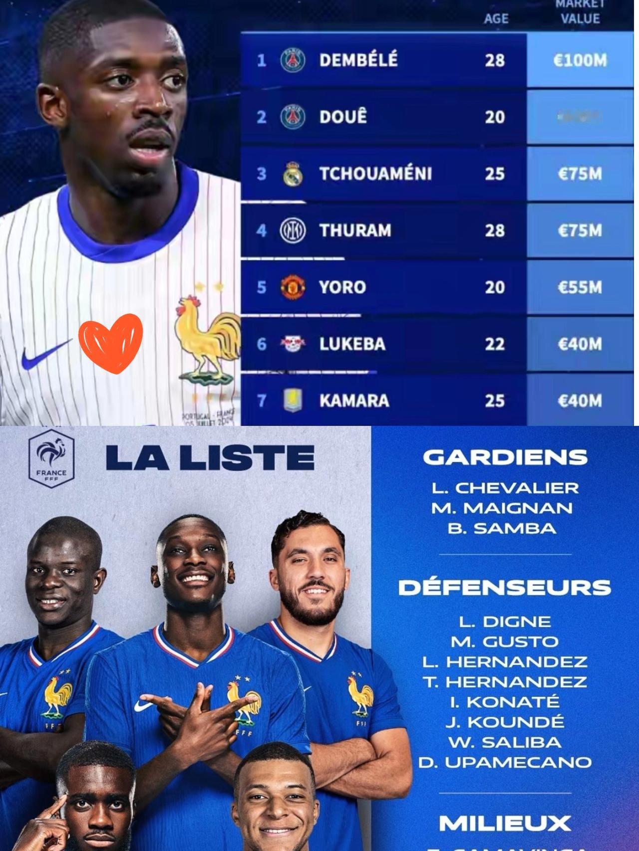 家人们直接看傻!法国队这人才内卷 也太离谱了吧?无缘本期名单的球员 身价榜一放,1亿欧的登贝莱、 9000万欧的杜埃领衔,随便拎一个出来 都是其他国家队抢着要的核心, 这哪是“落选阵容”, 分明是豪门顶配水平! 谁能想到,皇马主力琼阿梅尼、 实力悍将图拉姆都带着7500万欧身价 陪跑,更别说还有一堆三四千万欧的 实力派球员。这足以说明法国队的人才 储备根本不是“富裕”,而是 “溢出到浪费”——别的球队苦于 没人可用,德尚却要在亿欧先生里 挑挑拣拣,这种幸福的烦恼, 全足坛也就法国队独一份。 其实这背后藏着法国足球的底气, 完善的梯队建设让优质球员源源不断, 也让国家队的竞争力常年在线。 你们觉得这波无缘的球员凑成一队, 能在欧洲杯闯到哪一步? 评论区来聊聊你的看法~