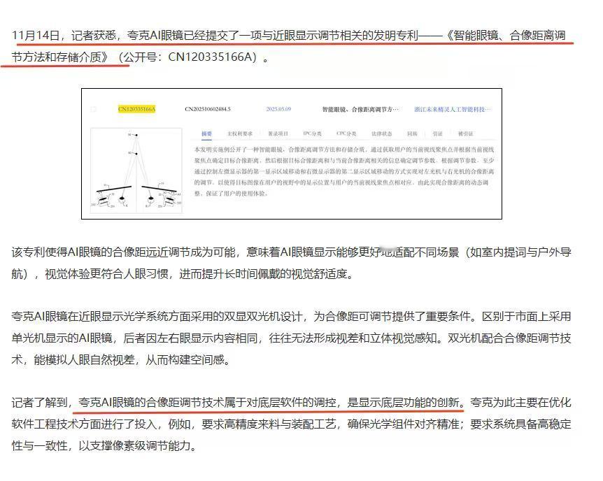 有一种强烈的预感,继国产新能源车、国产空调之后,中国下一个“全球爆款”会是AI眼镜! 今年以来,国内已经推出了多款AI眼镜产品,其中夸克AI眼镜绝对是最值得关注的一个。尤其是近期关于夸克AI眼镜的多个核心专利曝光,让大家看到了国产AI眼镜的技术实力。 就拿夸克AI眼镜的合像距调节技术来说,在行业算是独一份了,它能够根据远近场景的变化,自动调节虚拟画面的“视觉距离”,让眼睛不用硬扛着适应,自然就不容易出现眼酸、头晕的情况。 给大家举个例子,我们在室内念稿子、看文案,用到夸克AI眼镜的提词功能时,眼镜上呈现的虚拟画面就会调节得“离人近”,视觉上就跟我们看手机、看书是一样的。 再到户外场景,我们需要借助AI眼镜导航的一个地方,设备就会迅速把虚拟画面调得“离人远”,使得画面和远处的道路、景物相匹配,不用频繁切换视线焦点。 想想如果一款AI眼镜不能在实际使用中,解决人眼的视觉认知和物理现实不匹配的痛点,肯定就容易眼部疲劳,甚至头晕,更何谈长期佩戴。 所以夸克AI眼镜的这项专利算是突破了行业的一大难题。反观市面上大多数AI眼镜产品在这方面还有不足,或者说没法像夸克AI眼镜一样做到像素级的精准调节。 现在AI眼镜的消费者更多是冲着新奇体验去的,可以预见的是,未来AI眼镜一定会进入人们的生活中。IDC预测到2029年,全球智能眼镜市场出货量将突破4000万。 所以最后能在市场脱颖而出的一定是技术过硬,佩戴体验好的AI眼镜,也相信以夸克AI眼镜为代表的国产智能眼镜能够做到,成为又一个让老外都羡慕的“全球爆款”。