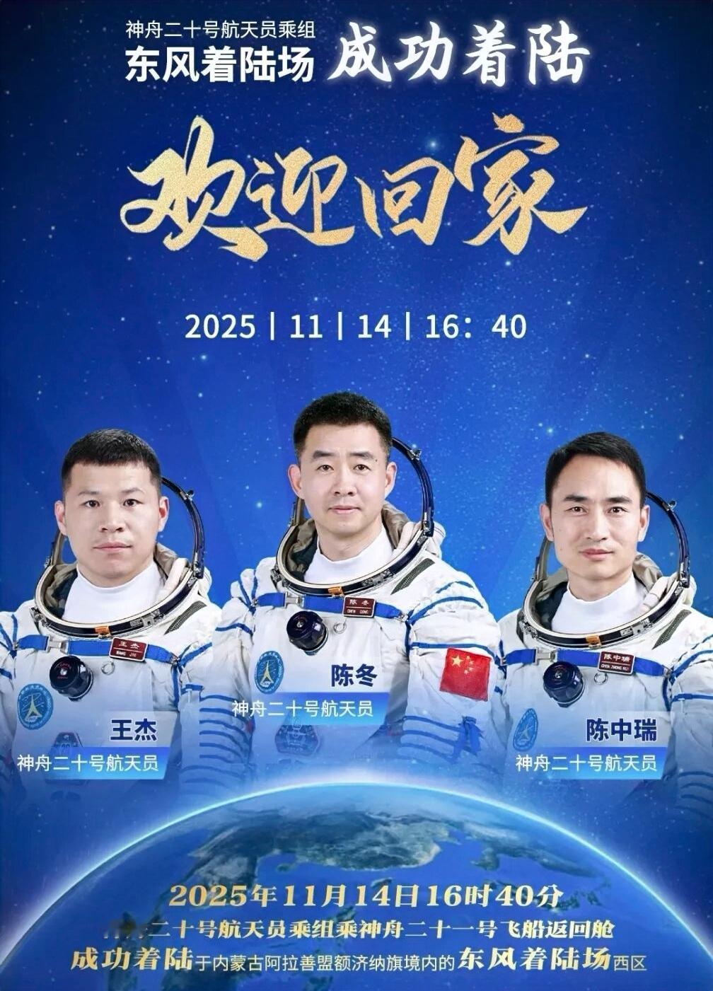 祝贺神舟二十号航天员安全返回地面,彰显我国航天科技的不断突破与发展。虽然返回舱舷