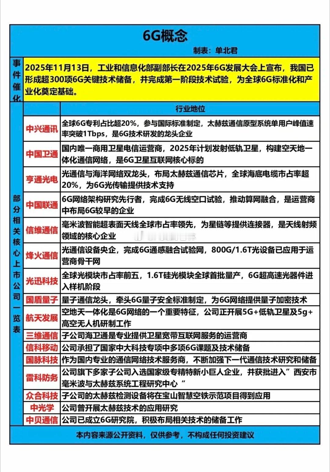 6G概念核心龙头!2025年11月13日,工业和信息化部副部长在2025年6G发展大会上宣布,我国已形成超300项6G关键技术储备,并完成第一阶段技术试验,为全球6G标准化和产业化奠定基础。