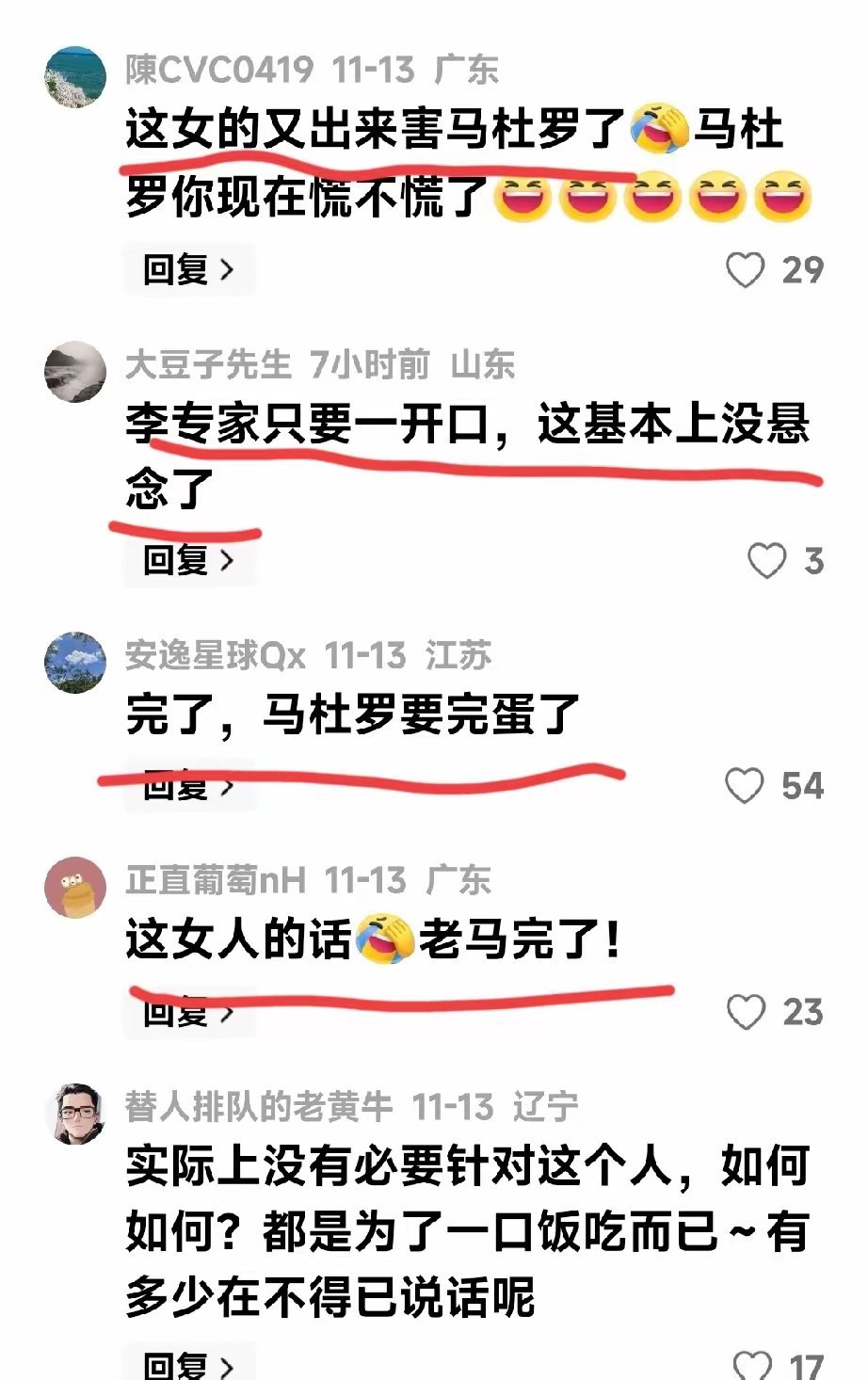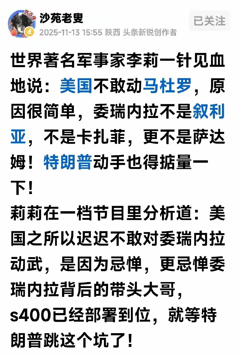 刚刚看到“沙苑老叟”先生的一篇文章,讲的是我国,当然更是世界著名军事专家李莉女士断定美国不敢动马杜罗,那可是非常的有理有据,因为马杜罗的背后有大哥,估计特朗普也会害怕的,因为他也会害怕中了S400的埋伏呀。“沙苑老叟”的文章写道:——世界著名军事家李莉一针见血地说:美国不敢动马杜罗,原因很简单,委瑞内拉不是叙利亚,不是卡扎菲,更不是萨达姆!特朗普动手也得掂量一下!——莉莉在一档节目里分析道:美国之所以迟迟不敢对委瑞内拉动武,是因为忌惮,更忌惮委瑞内拉背后的带头大哥,s400已经部署到位,就等特朗普跳这个坑了!我对李专家是非常信任和崇拜的,毕竟她经常上权威媒体指点江山,给俄乌冲突把血脉,对中东战争开药方,基本上都是对症下药,灵验的很,比赵树理小说《小二黑结婚》里面的二诸葛还厉害。不过我看后面文章评论区里面的网友似乎和我的观点不同,评论很多,而且观点基本一致就是“这下马杜罗要完了”,认为既然李将军开口讲话了,马杜罗就能去见卡扎菲了!评论很多,我就不多说了,我把他们截图在下面,大家自己看吧。