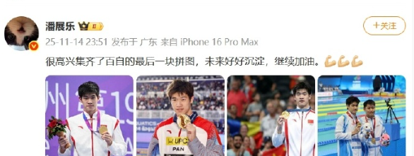 11月14日晚,潘展乐全运会100自夺冠后发文:很高兴集齐了百自的最后一块拼图,未来好好沉淀,继续加油。