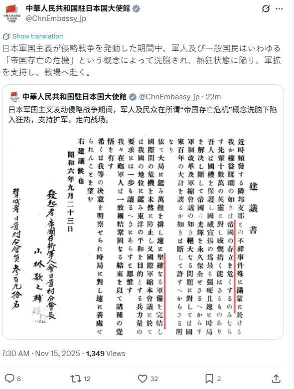 高市早苗露出了獠牙,在发表涉台恶劣言论后,又在考虑修改日本“不拥有、不制造、不运进”核武器的无核三原则,修改后将坚持“不拥有”和“不制造”,但是取消“不运进”的核政策,高市早苗此举,用意非常明显,就是为了能够让美国核武器能够运进日本来,加强美国对日本的安保强度。 中国不首先使用核武器,不对无核国家使用核武器,那是不是说,美国的核武器在日本,也就等同于日本也算是拥核国家了,那是不是说,中国完全在必要时候直接对日本使用核武器了[狗头]! 高市早苗是日本极右翼势力,代表的其实是日本军国主义的余孽,从高市早苗一连串动作可以看出,高市早苗是打算将日本直接带回军国主义的老路了。但是我们不得不提醒日本,中国多次明确强调过,绝不容许日本军国主义卷土重来,这不是一句泛泛口号,而是中国的坚守,中国的底线! 中国驻日本大使馆直接用日语发文,表示日本军国主义发动侵略战争期间,军人及民众在所谓“帝国存亡危机”概念洗脑下陷入狂热,支持扩军,走向战场。言外之意就是在警告日本不要忘记历史,更不要重蹈覆辙!