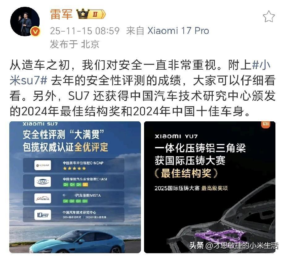 雷军:从造车之初,我们对安全一直非常重视。 小米汽车雷总今天在微博发文分享小米SU7 获得中国汽车技术研究中心颁发的2024年最佳结构奖和2024年中国十佳车身。 XaomI YU7 一体化压铸铝三角梁,获国际压铸大赛,最佳结构奖,2025国际压铸大赛最高级奖项! 今天雷总还和网友积极互动,在微博上及时回答了网友的提问。 有位网名叫自在极意拳的网友非常犀利地问雷总:“你接受采访不是说好看才最重要吗!” 雷总回答说: 安全是产品的基础和前提。 雷总还表示我们会继续改进,不断改进,把产品做得更好。 小米在2021年3月30日正式官宣进军智能电动汽车行业,2024年3月28日小米SU7正式上市 ,2025年6月26日小米YU7正式上市,小米汽车全系累计销量超40万辆!小米yu7在10月销量33662辆,超过毛豆Y在国内SUV销量排名第一,骂的越惨,销量越打脸,数据不会说谎,反转就这么朴实无华!造车三年苦,一举成名天下知!