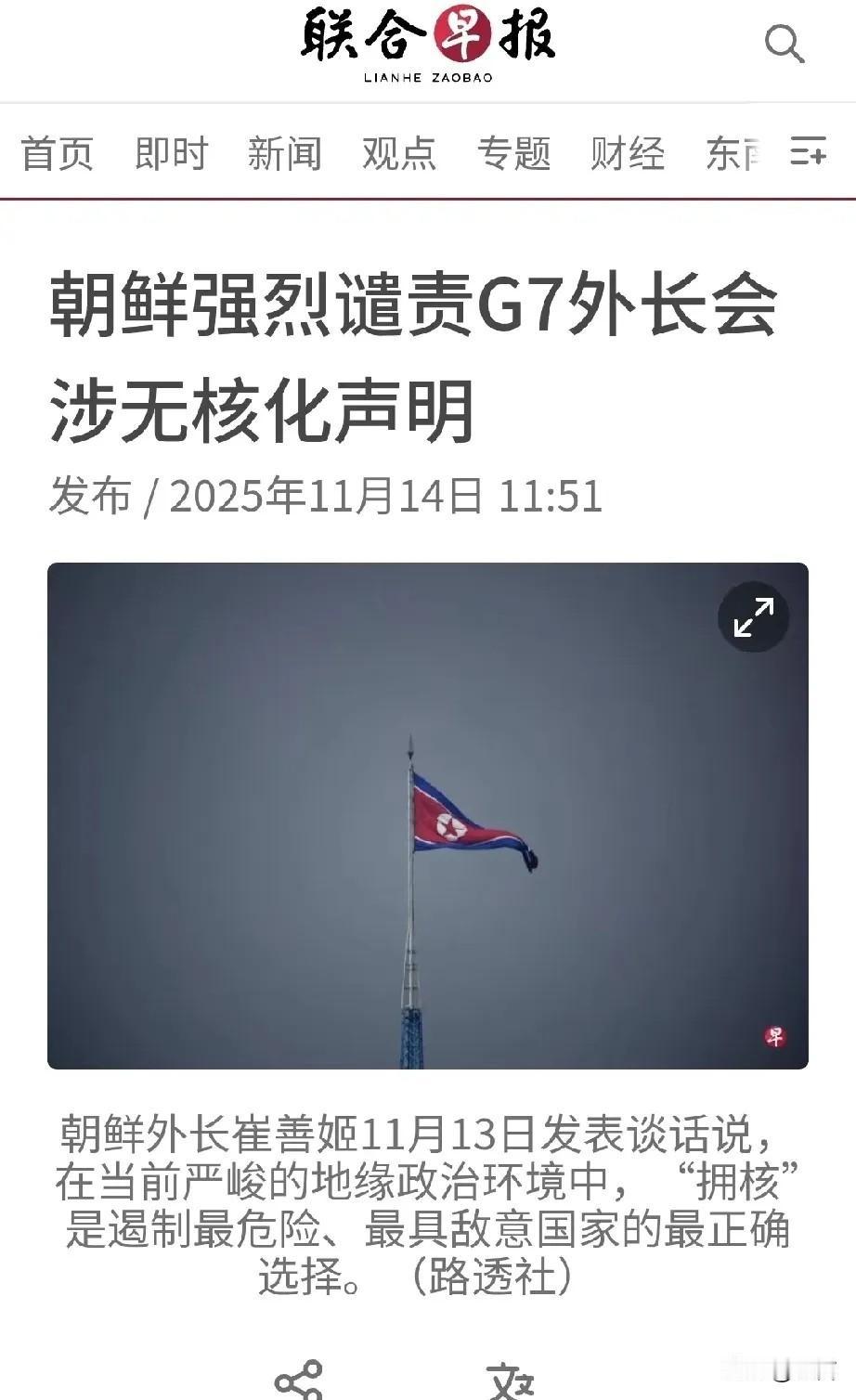 全球真正拥有核武器的国家只有9个,其中中国及其周边就有5个国家拥有,这是全世界独一无二,又极其复杂的地缘环境 旗帜鲜明的支持G7推进朝鲜半岛无核化,才有可能避免东亚“核武装”,不让地区形势进一步复杂化。 在朝鲜半岛去核化的同时,才能有效要求美国阻止日,韩拥核,这是百年大计。 有些核心利益,和立场无关。是需要坚持,和强有力的维护。东亚一旦“核武装”,即使美国有一天撤出局面就能打开吗!