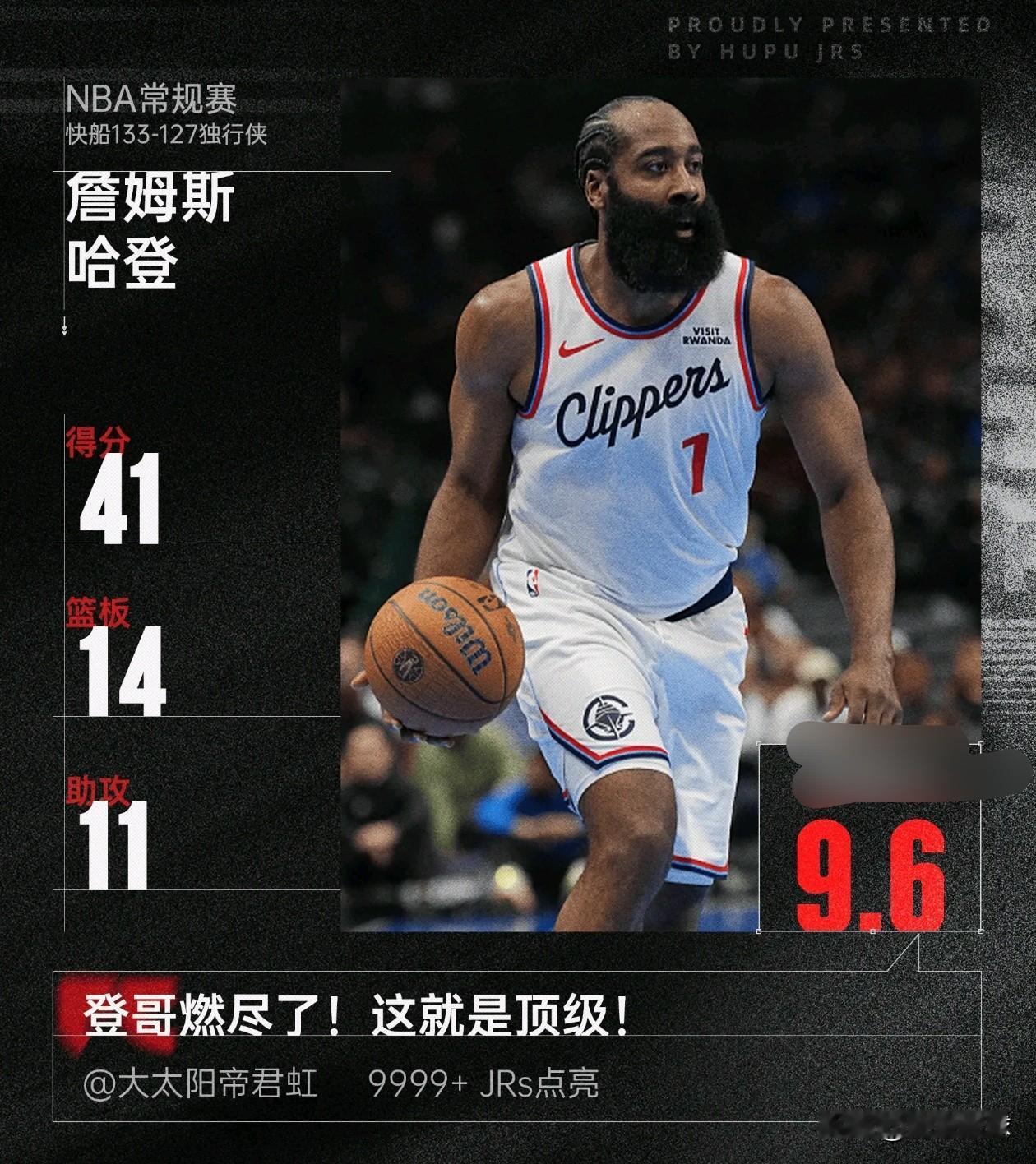 燃爆全场!36岁哈登51分钟血拼创历史,成NBA最老40+三双得主 当36岁81天的哈登在场上鏖战51分钟,每一次突破、每一次传球都带着“燃尽自己”的决绝,这场比赛注定被载入史册!面对独行侠,哈登用25中13的高效表现,轰下41分14篮板11助攻1抢断2盖帽的超级三双,带领快船终结六连败。 这不仅是一场胜利,更是一次纪录的颠覆——他超越拉里·伯德,成为NBA历史上最年长的40+三双获得者 !51分钟的出场时间,在节奏飞快的现代NBA堪称“铁人壮举”,而14篮板创下其赛季新高,2盖帽更是展现了他攻防两端的全面爆发。 时隔4年半,哈登再次解锁40+三双成就,三分线外12中6的精准投射、罚球线11中9的稳定输出,印证着老将的油箱依旧满格 。从串联全队的11次助攻,到拼抢篮板的不依不饶,他用行动诠释了“核心”二字的重量。 没有年轻球员的冲劲,却有岁月沉淀的智慧与坚守。36岁的哈登用一场极致表现告诉世界:传奇从不因年龄褪色,拼搏就是最好的勋章! 哈登 快船